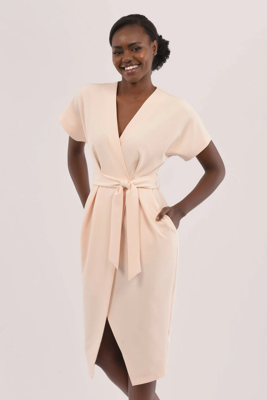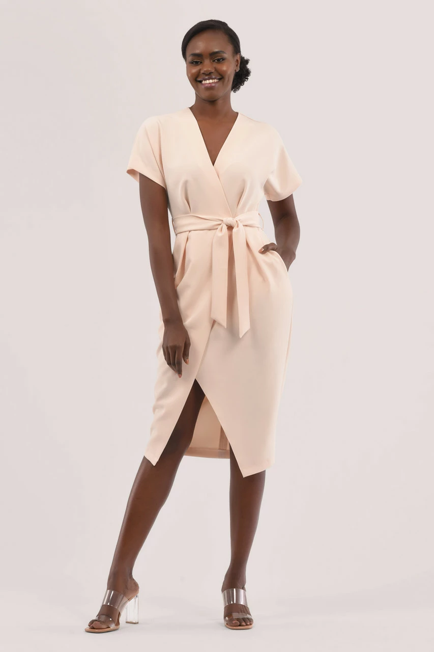 Details: Tie waist front, Side pockets, Wide sleeves, Wrap front, Cut slit front, Tulip style skirt, Kimono sleeves