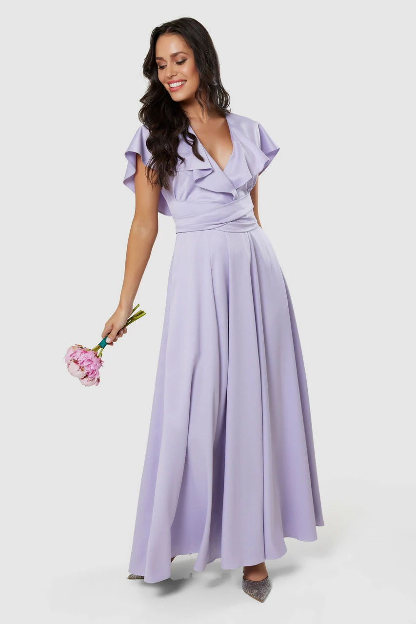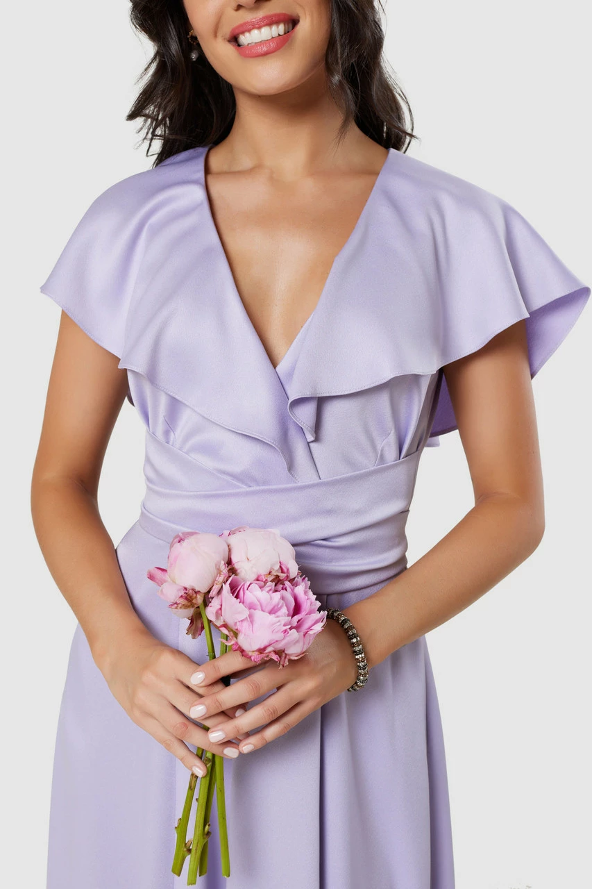 One of our best selling bridesmaid dresses. It has a wrap cape collar, Full panelled skirt with split, packets, and extra long tie belt that wraps around the waist