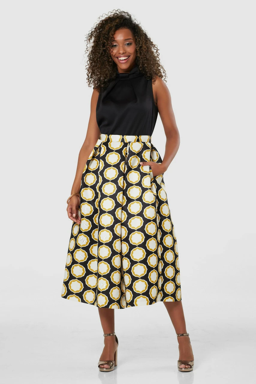Our bestselling Closet Gold 2-in-1 Dress with a Black top and geometric print that makes it perfect for an evening event.