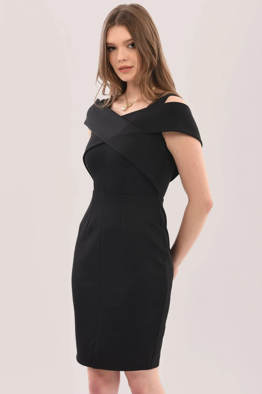 Details: Cross design front ,Fitted bodice, Mini dress, Striking Bardot neckline, Pencil style silhouette, Cold shoulder straps