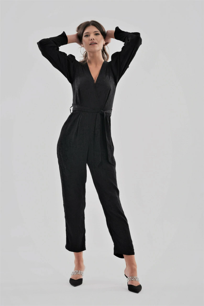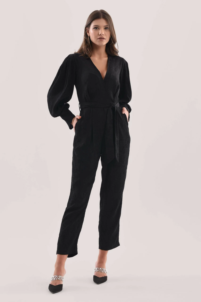 Details: Wrap front, Tie waist front, Side pockets, Unlined, Dropped shoulders, Wide leg trousers, Belt included, Gathers at shoulders, Cuff detailing