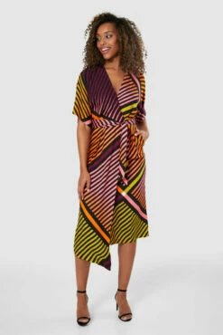 Details: A- line silhouette, Wrap front, Tie up waist, Midi dress, Overlapping panels, Kimono sleeves
