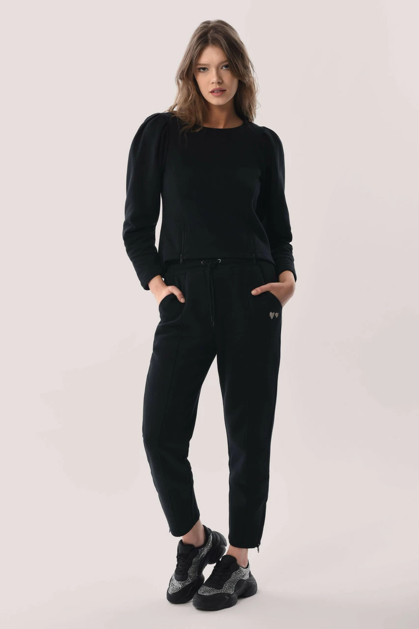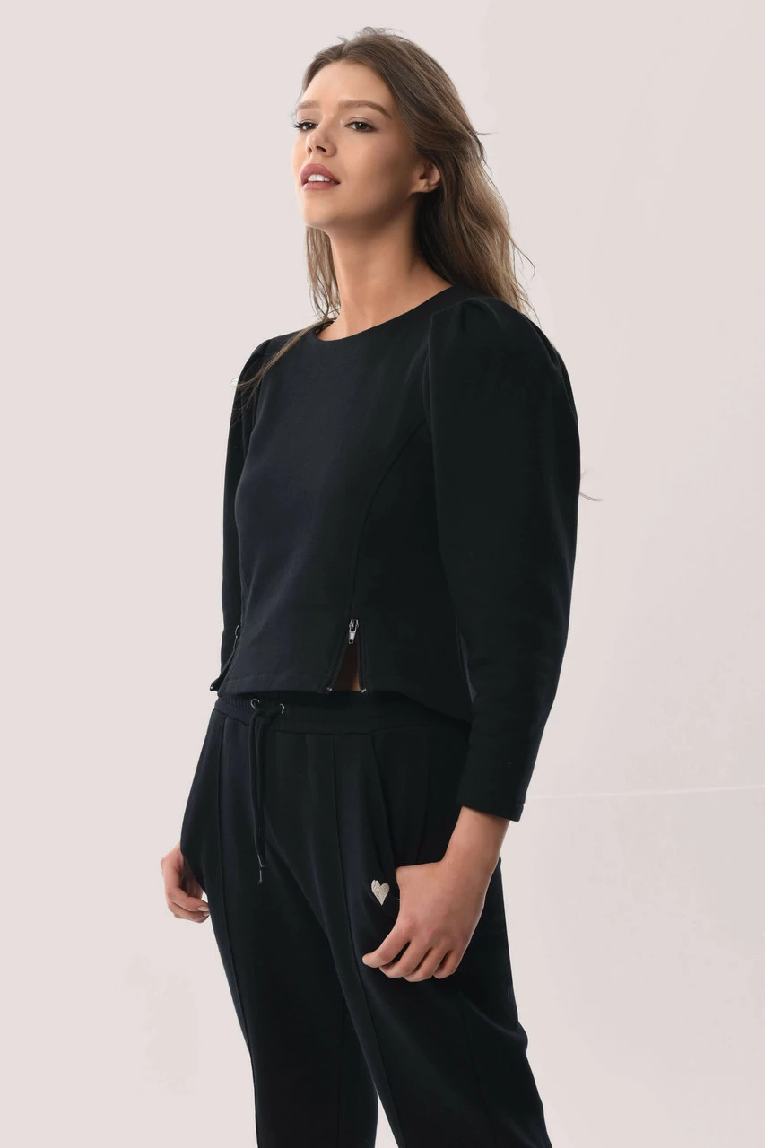 Details: Puff sleeves, Shaped hem, Embroidered hearts, Zips on front, Gathers on shoulders