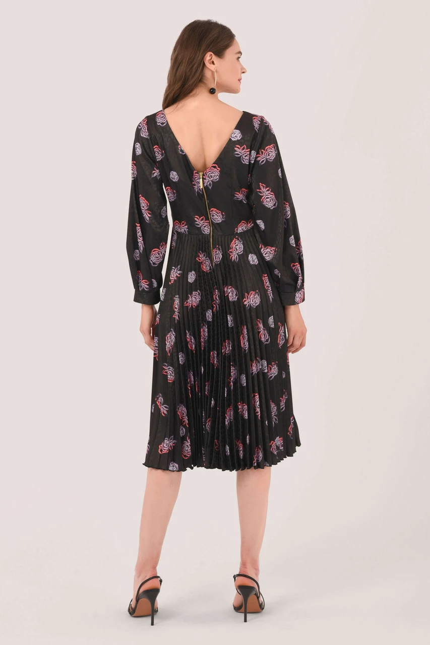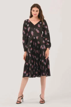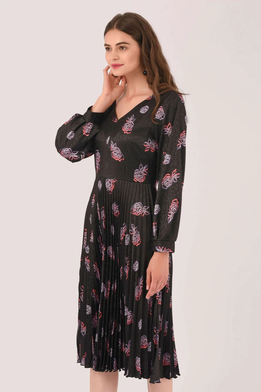 Standout and make a statement with this easy to wear style made in a subtle leopard jacquard fabric with, lilac and coral printed cabbage patch roses. With full length sleeves and cuff detail, this dress has a v neck back and front and a gorgeous sunray pleated skirt which sits just under the knee.