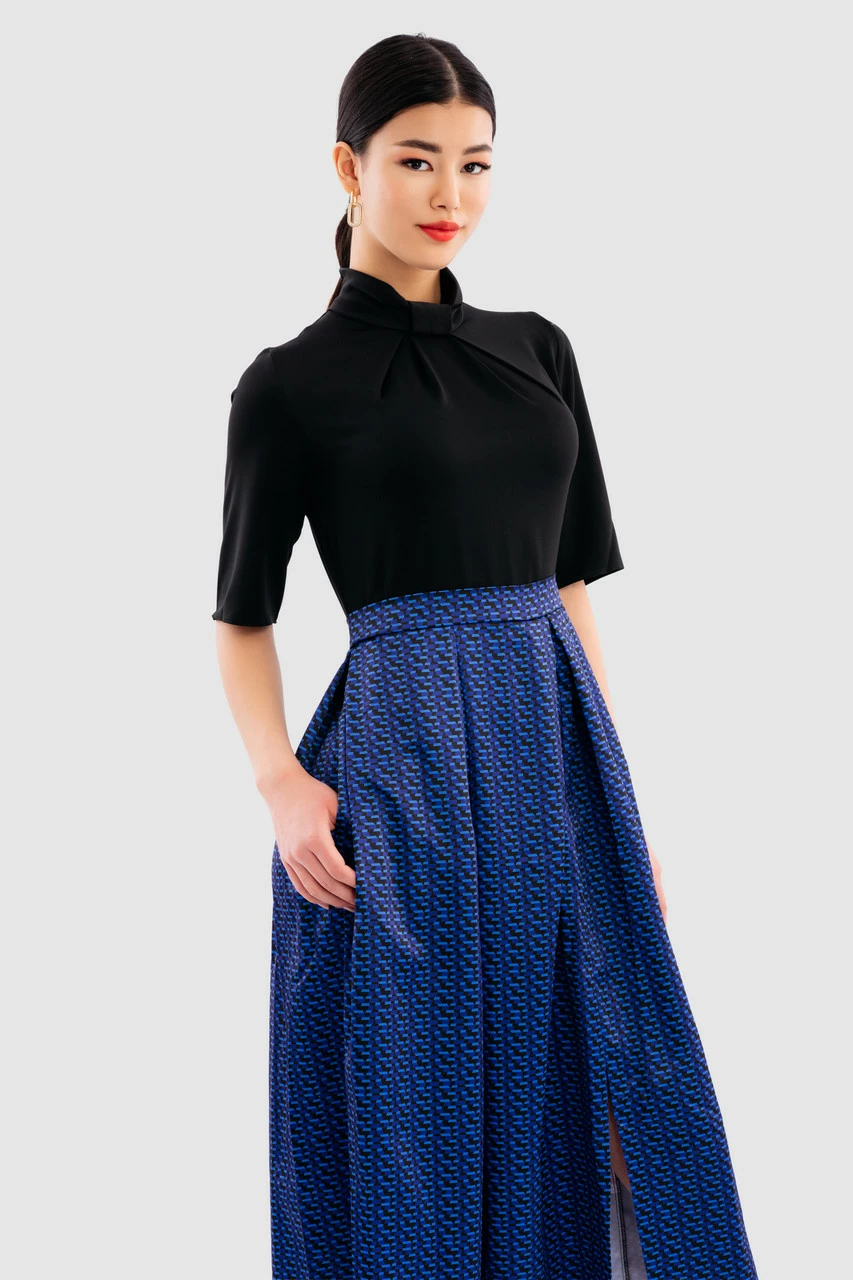 Details: V- back, 2 in 1 dress, Box pleats, Waistband, Front neck knot detail, Front cut split, Side pockets, Back keyhole