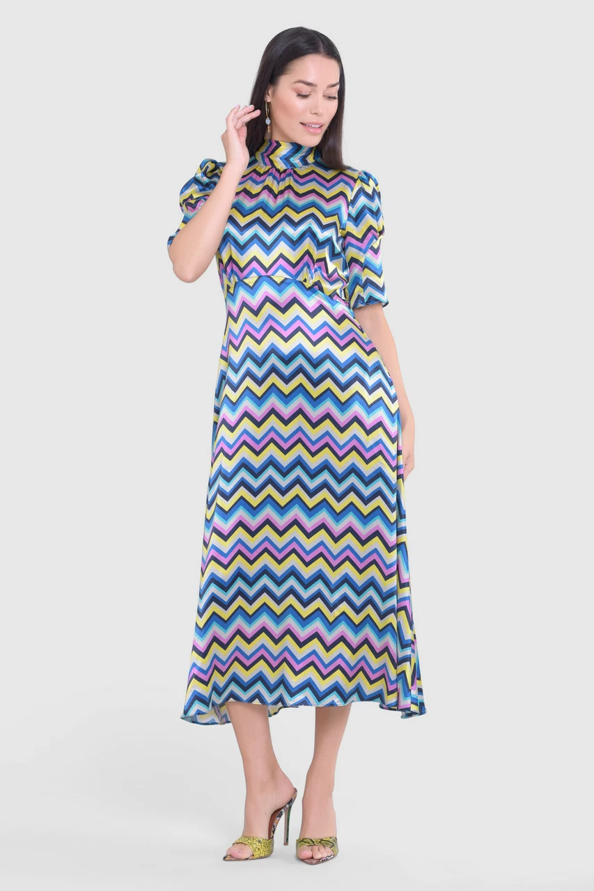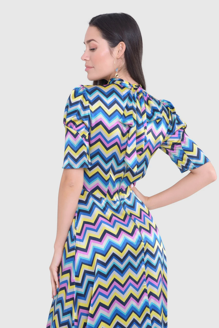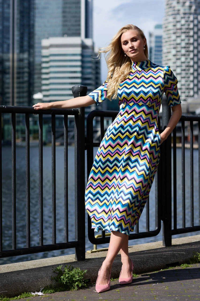 We have elevated our favourite dress by cutting it in a sumptuous Viscose Satin with a colourful chevron print.