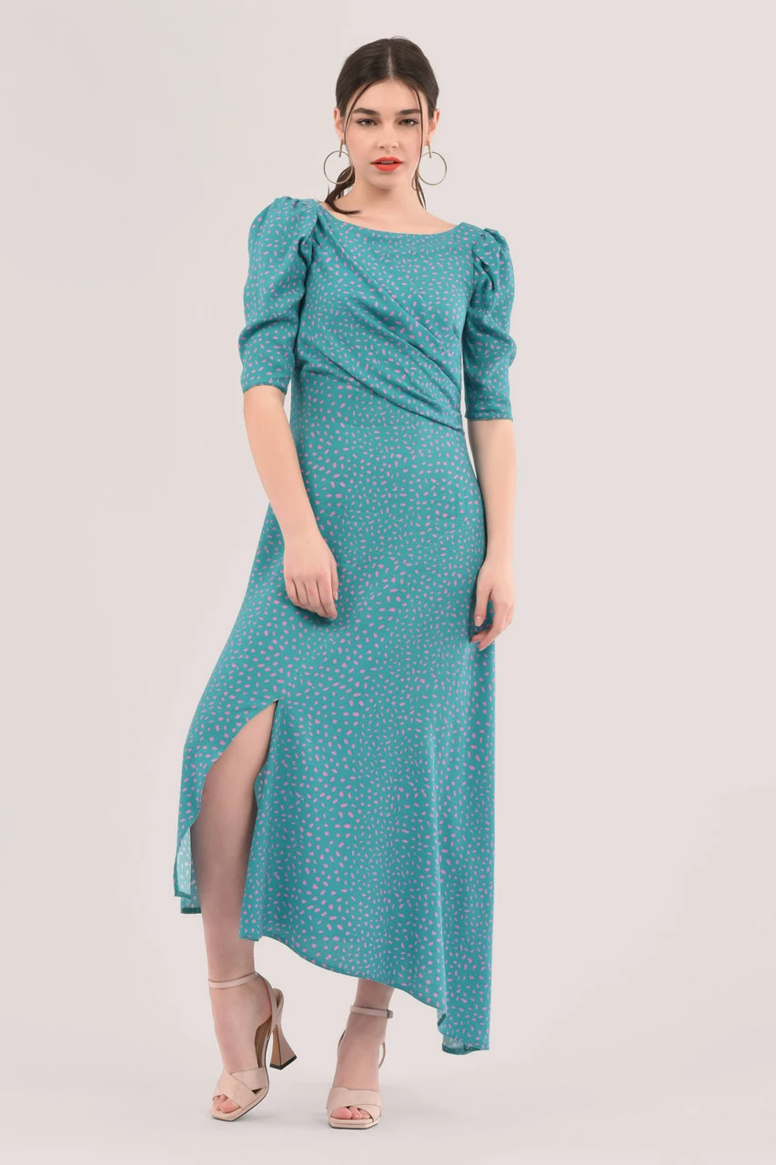 Details: Maxi, Puff sleeves, Gathers on shoulders, Side cut slit, A-line silhouette, Plunge back, Front pleats