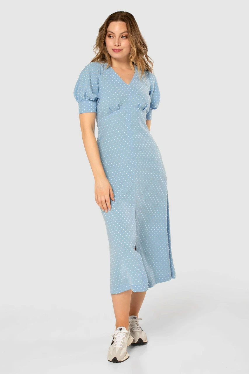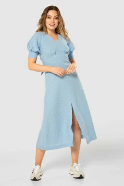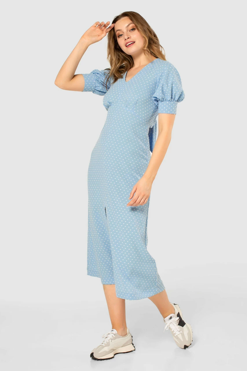 A Dress that makes a stunning exit with it’s open back and tie in a blue and contrasting white dobby fabric.