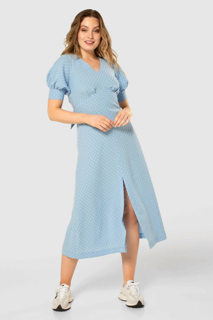 Details: Tie up back waist, Open back, A- line silhouette, Puff sleeves, cuff detailing, Front cut split