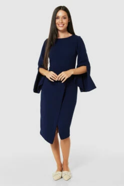 This Blue flared sleeve pencil midi dress has a split skirt design and features flared sleeves and Round neckline. This elegant dress is perfect for any occasion, from weddings, cocktail parties to work. Pair with some heels or wedges for the perfect night out ensemble.