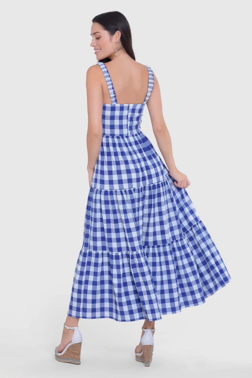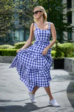 An easy-tiered dress in blue seersucker gingham that is perfect for hot summer days