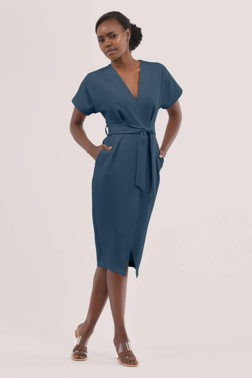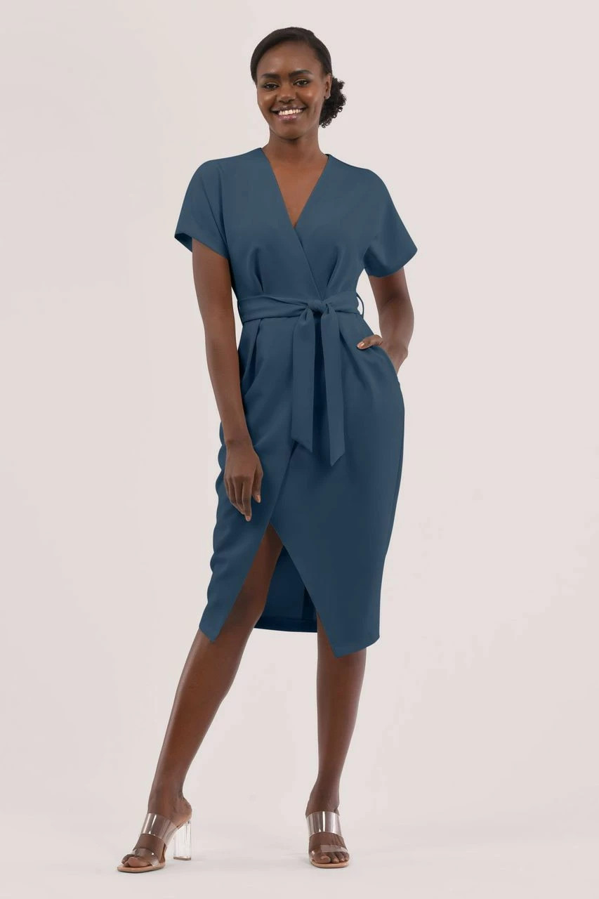 Details: Tie waist front, Side pockets, Wide sleeves, Wrap front, Cut slit front, Tulip style skirt, Kimono sleeves