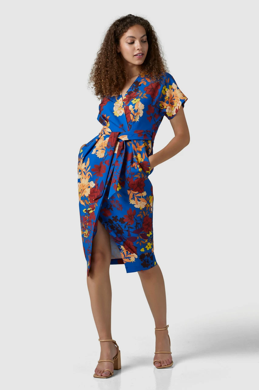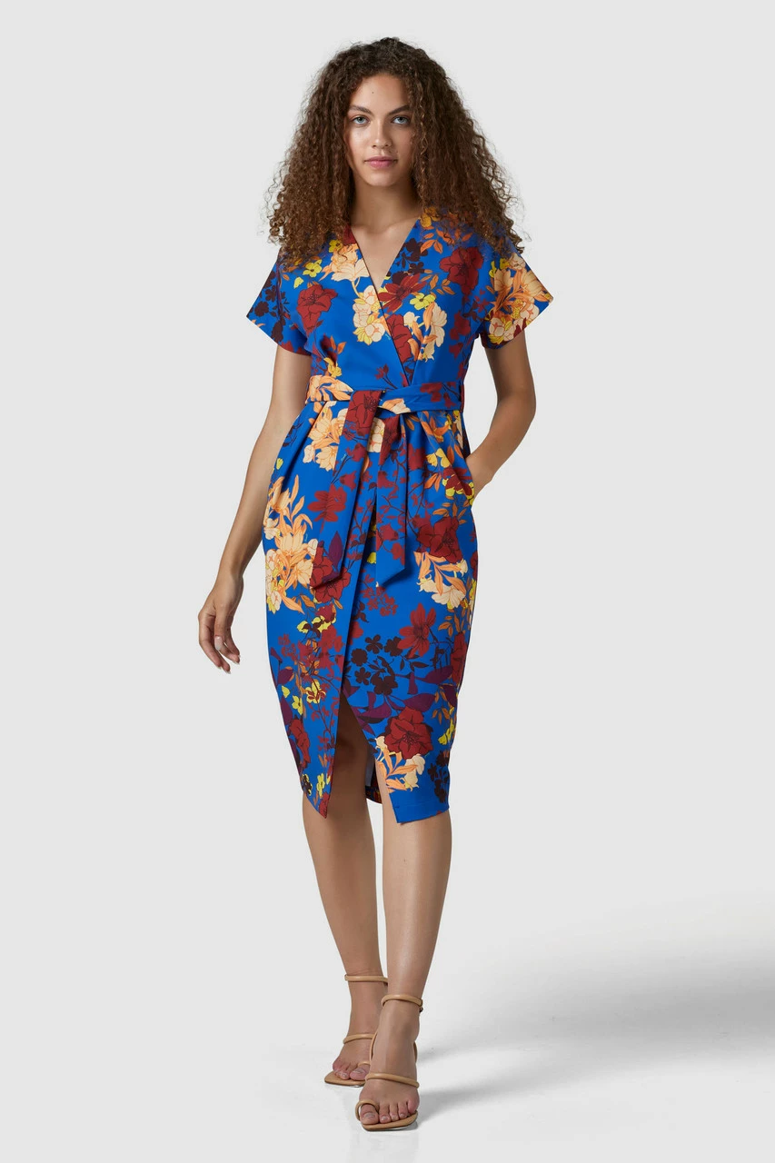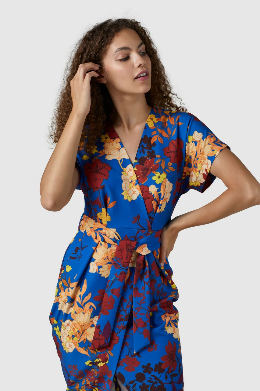 Details: Kimono sleeves, Loose fitting, Wrap front, A-line silhouette, Belt included, Fitted waistband, Overlapping panels, Floral print