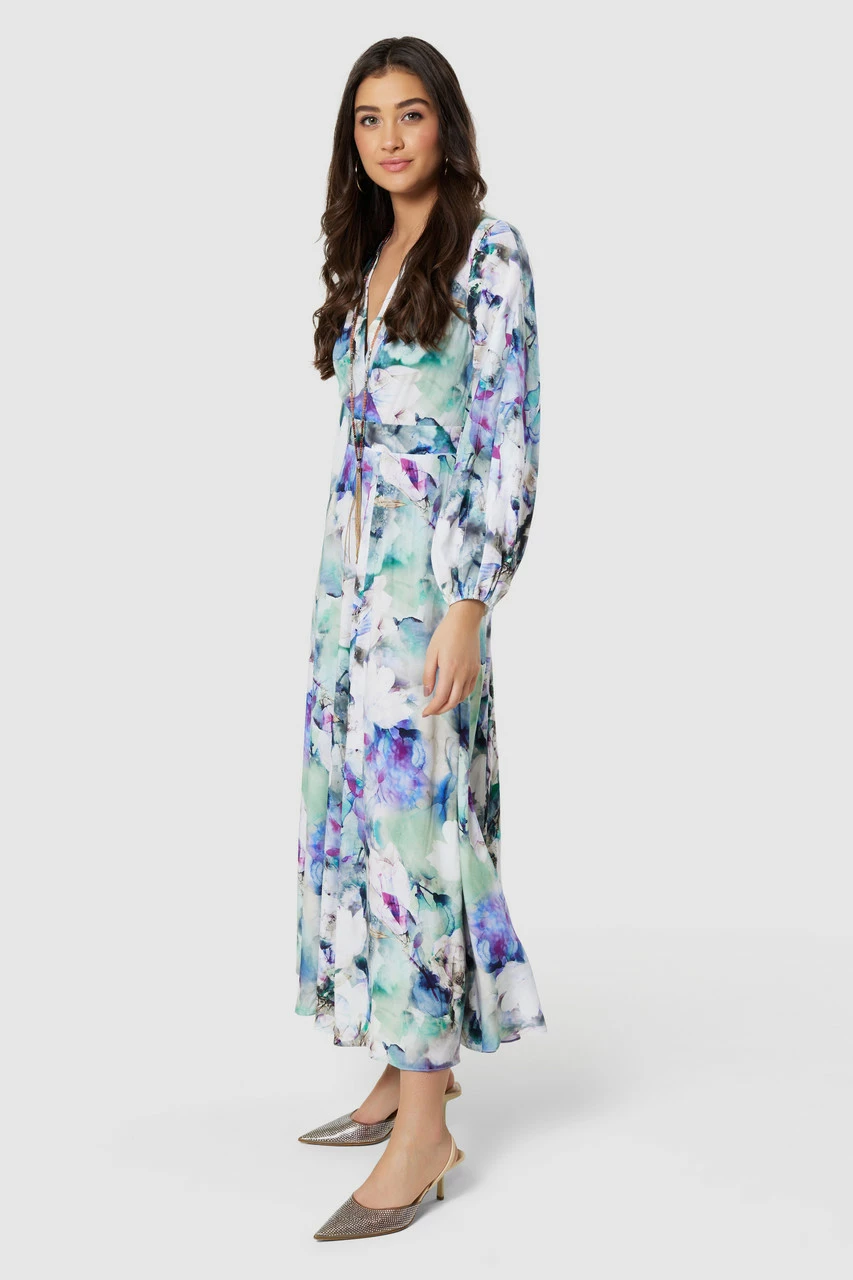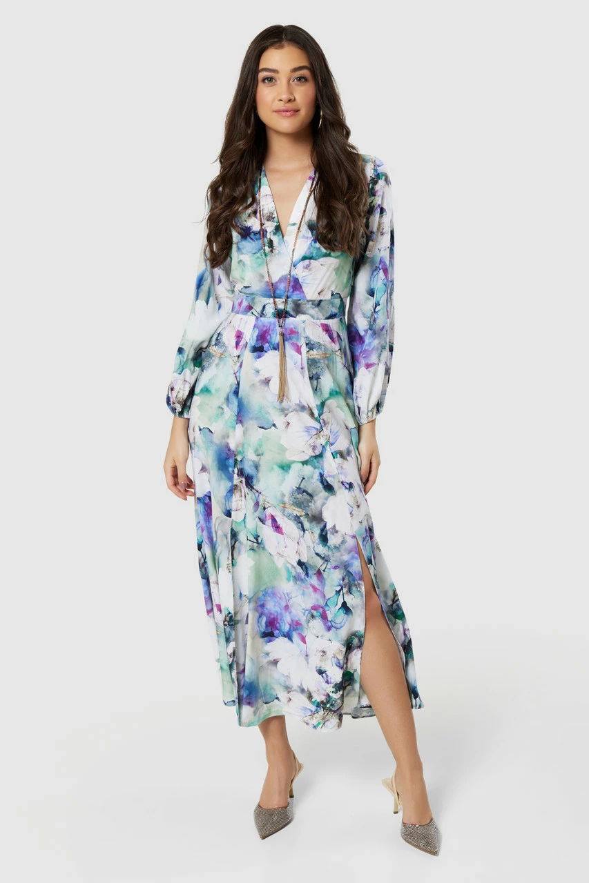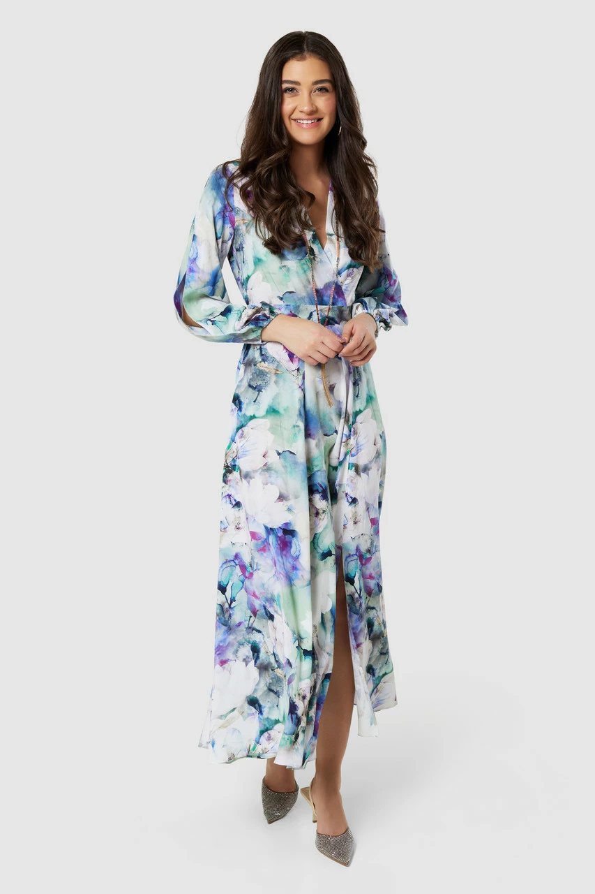 Details: Front cut split, Split sleeves, Elasticated cuffs, A- line silhouette, Wrap front