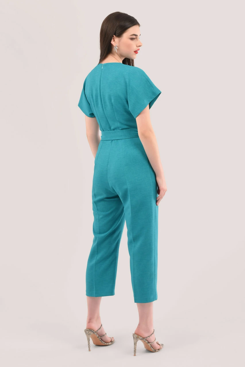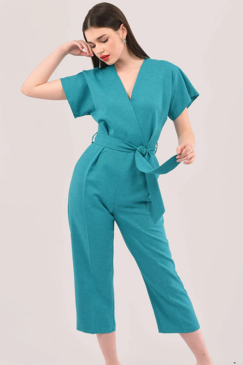 Details: Wrap front, Tie waist front, Side pockets, Unlined, Cropped leg, Kimono sleeves, Wide leg trousers, Belt included