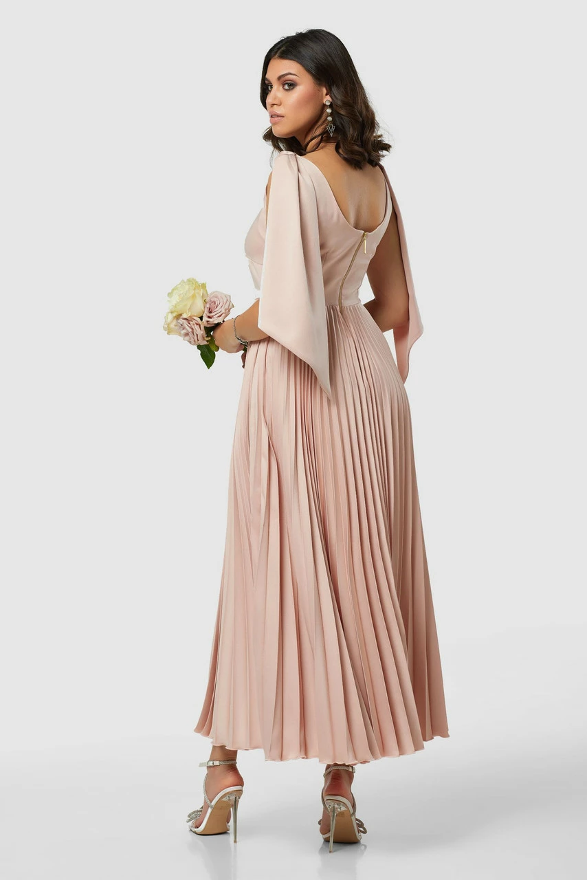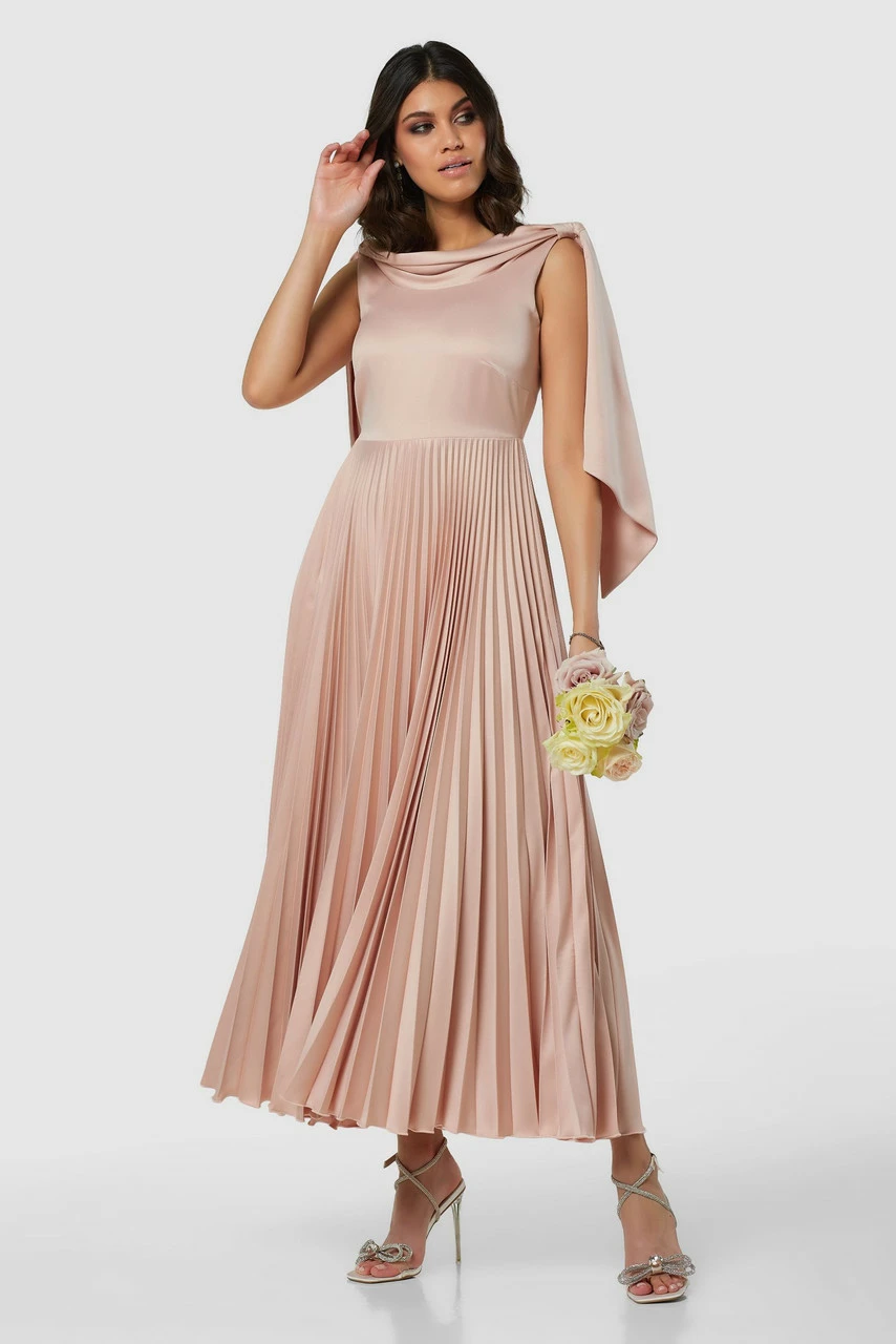 Elevate your style with our Midi Length Bridesmaid Dress. This dress features a cowl neckline, pleated skirt, and drape detail, all in a luxurious crepe fabric. The fit & flare hemline and blush color create a timeless and sophisticated look, making it perfect for any special occasion. Whether you’re a bridesmaid or a wedding guest, this dress is sure to make you feel confident and beautiful.