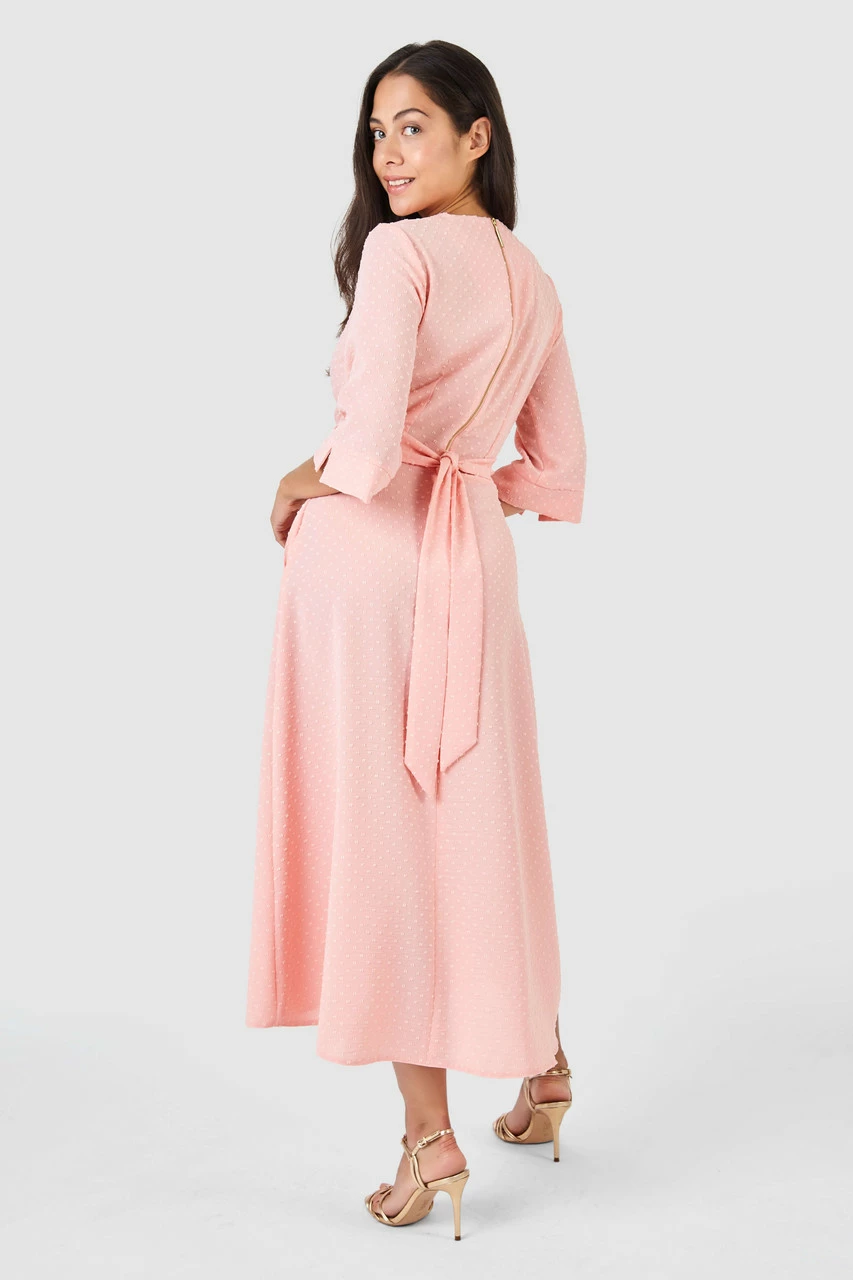 Details: Tie up waist, Wrap front, High low dress, Fitted waistband, A-line silhouette, Bell sleeves, Dobby dot texture