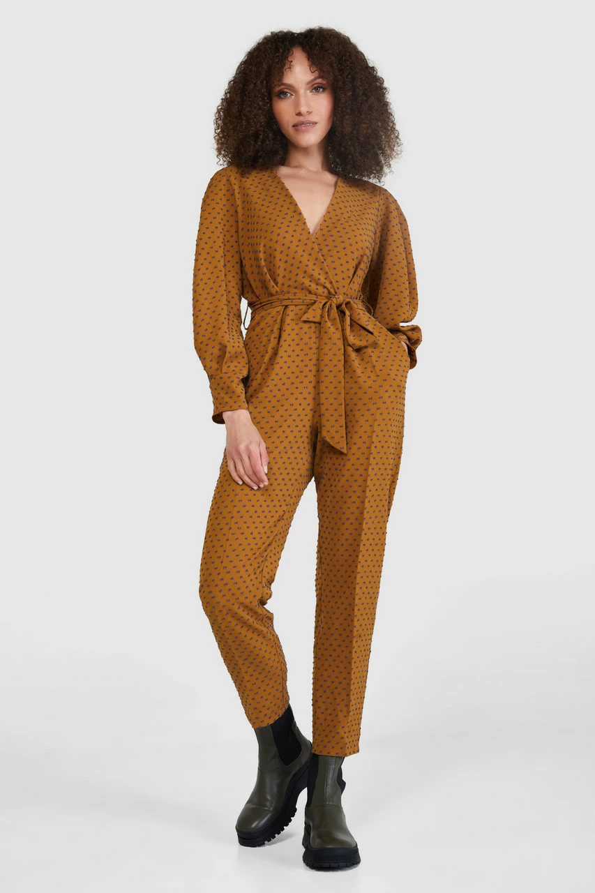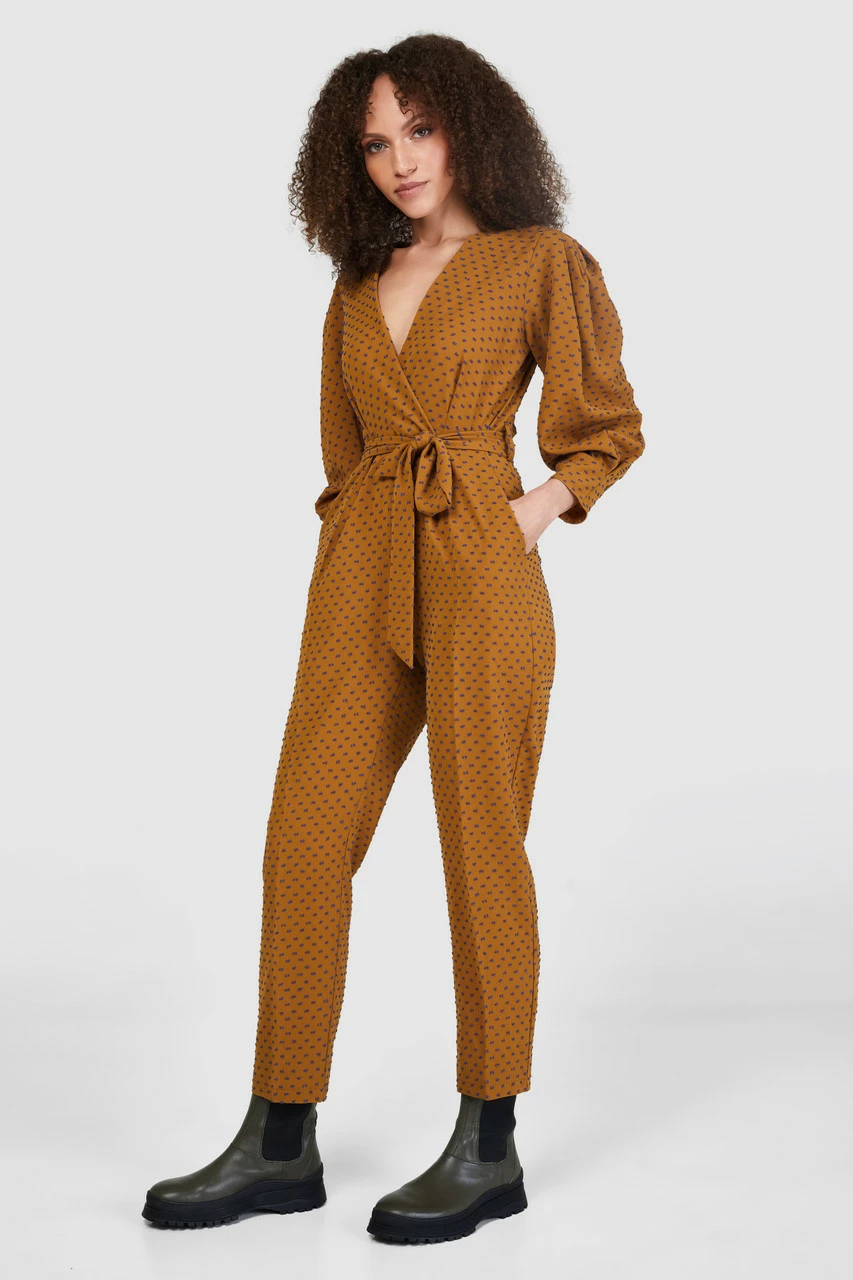 A bronze and blue dobby-wrap jumpsuit with a pleated sleeve and tie belt
