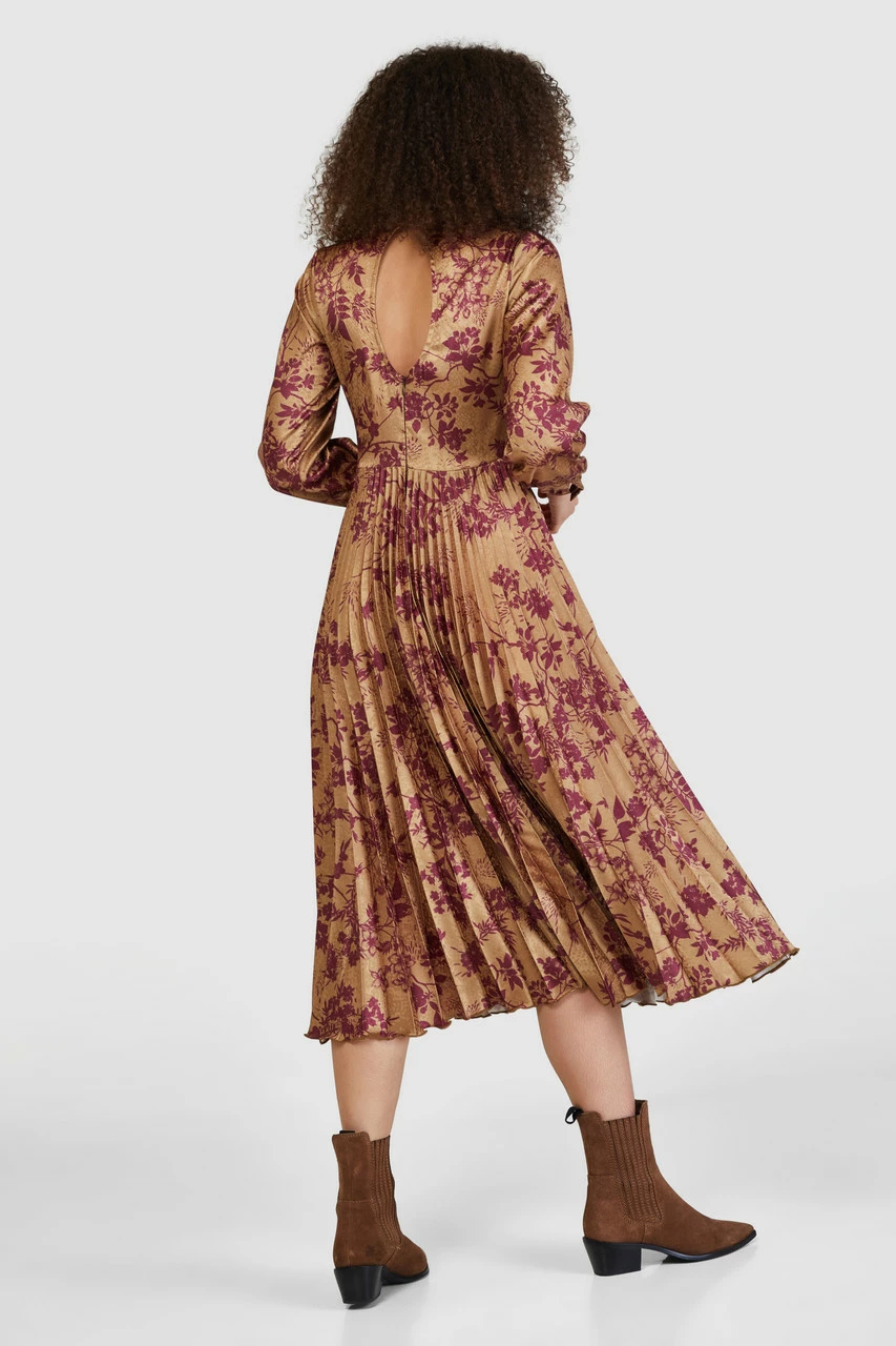 Details: Puff sleeves, A- line silhouette, Pleated skirt, Midi dress, Cut out back, Cuff detailings, Fit & flare hemline