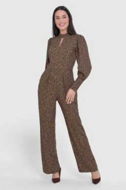 A Bronze animal printed Viscose Jumpsuit with a straight leg, high neck and puff sleeves with a deep cuff.