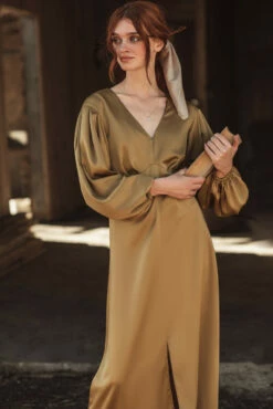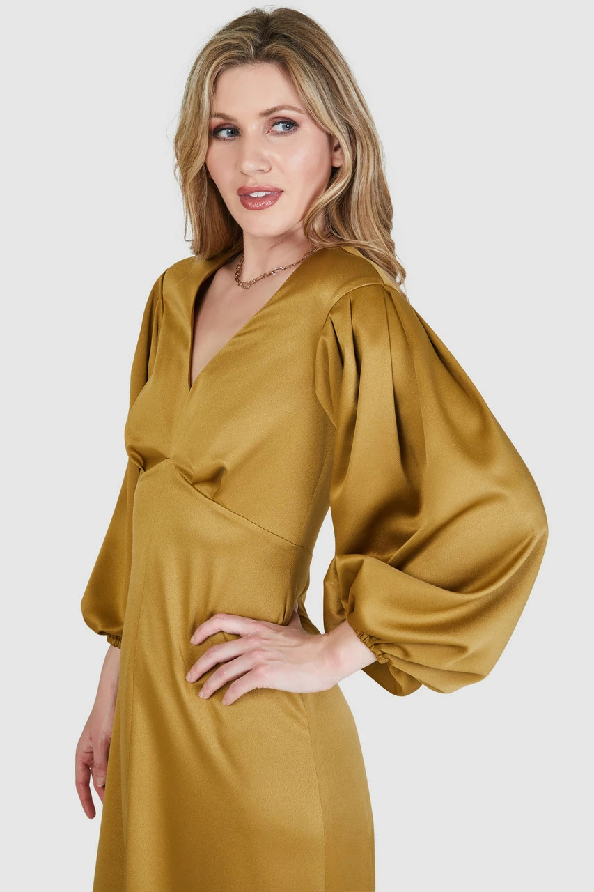 A V-neck Dress with a dropped shoulder, puff sleeve and shaped under bust seam in a recycled satin.