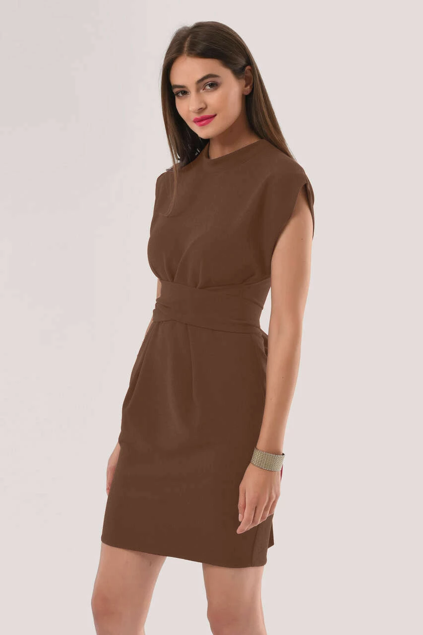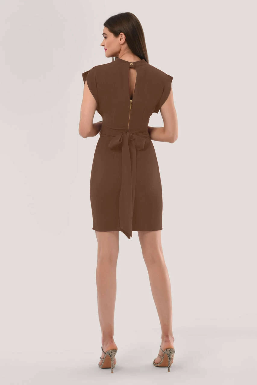 Details: Tie back waist, keyhole details, Cap sleeves, High collar, Mini dress, Wrap waist details
