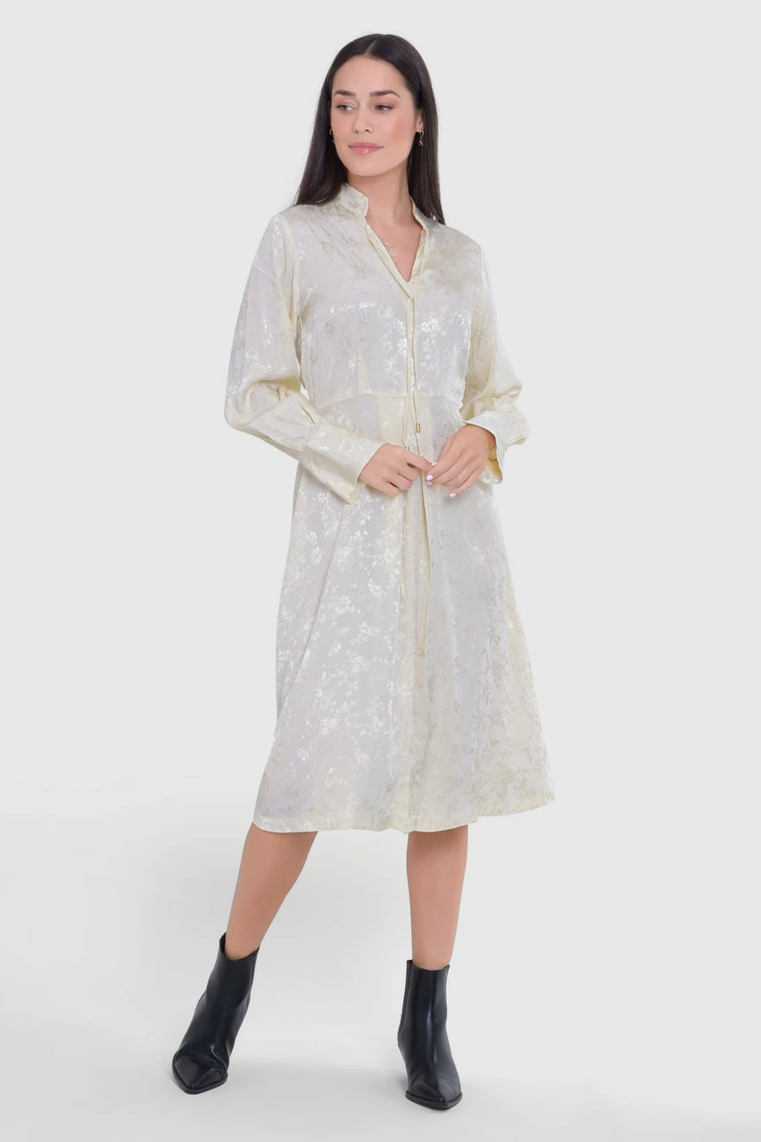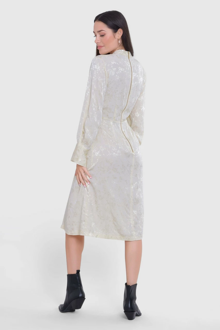 This midi dress has a soft gathers at the neck, a stand collar and ties at the neck and is made in a soft cream viscose