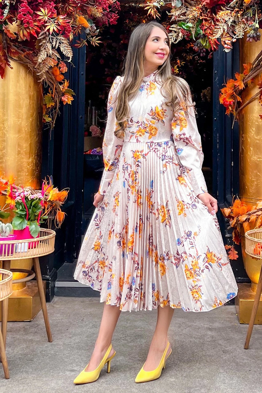 A pretty floral printed textured Jacquard dress with a sunray pleated full circle skirt, high neck and puff sleeve.