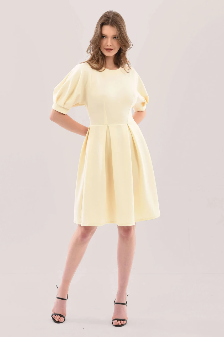 Details: Midi, Pleated skirt, Puff melon sleeves, Gathers at shoulders, Flare &fit hem, 3/4 Quarter sleeves