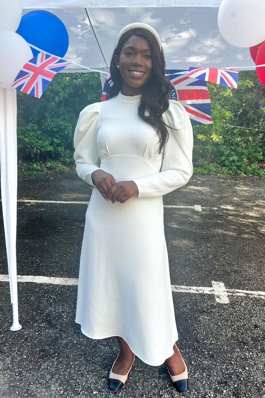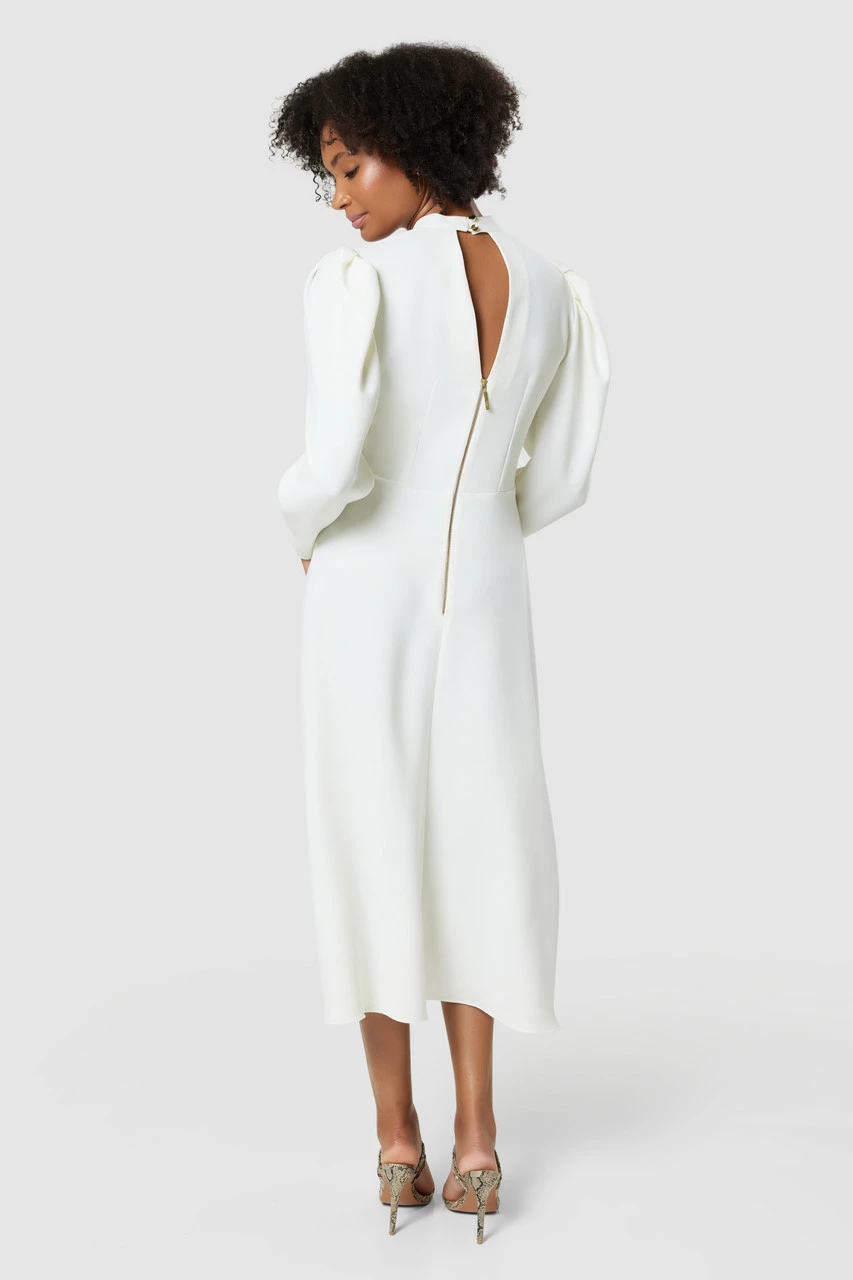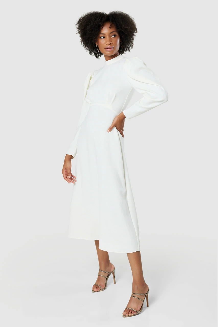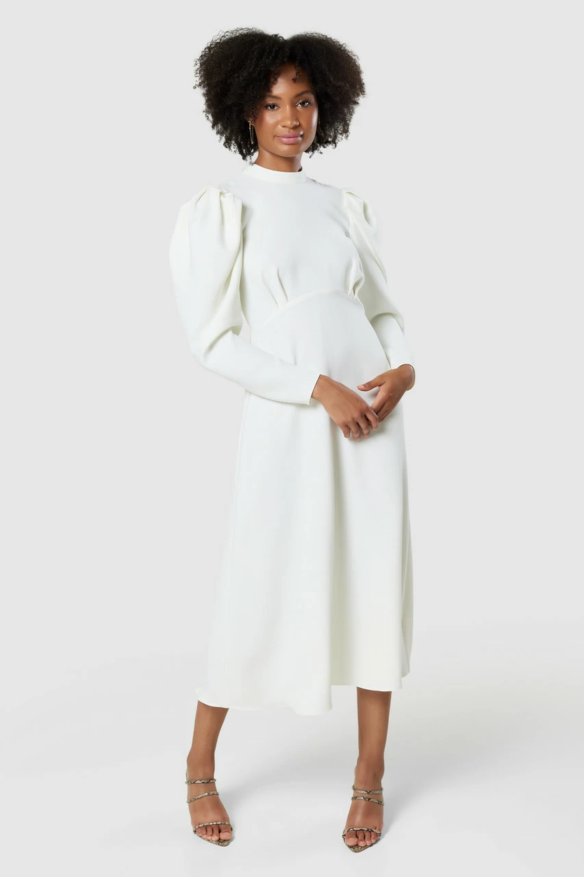 We have given our best-selling high-neck midi dress a makeover,cut it in a chic winter white and added full-length of leg-of-mutton sleeves
