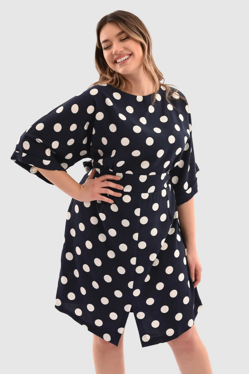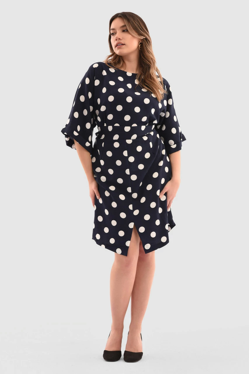 Details: Kimono sleeves, Waistband, Loose fitting, A-line silhouette, Front cut split, Polka dot print