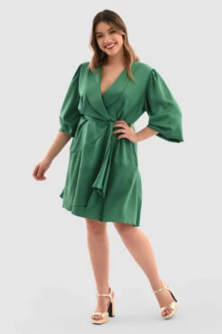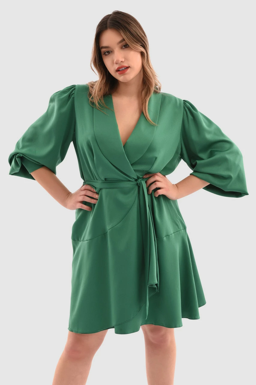 Details: Mini, Tulip skirt, Tie waist front, Wrap front, Belt included, Puff sleeves, Drape detail on neck