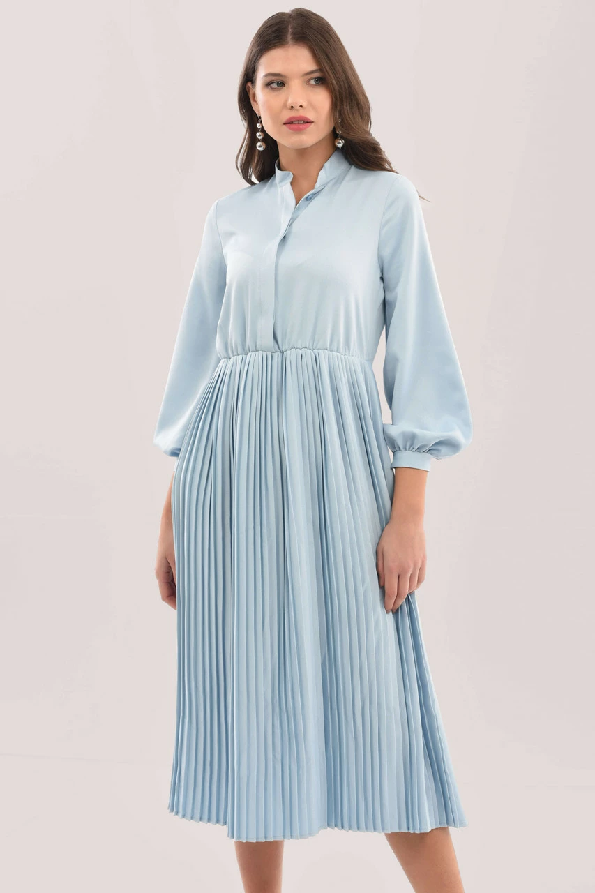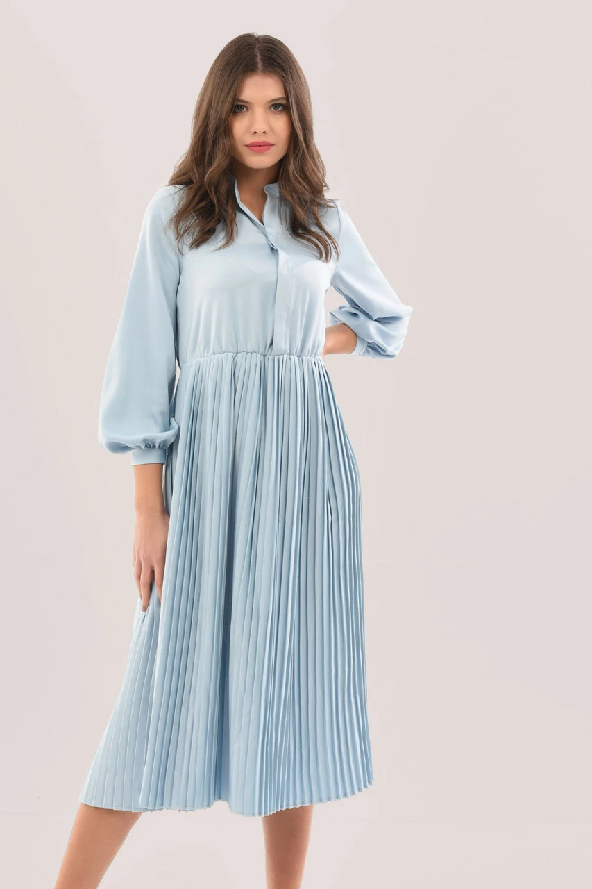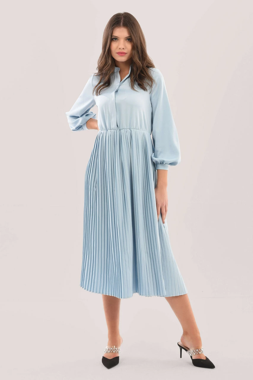 Details: Gathered cuffs, Puff sleeves, Gathers at waist, Knife pleated skirt, Flip up collar, Elasticated waistband