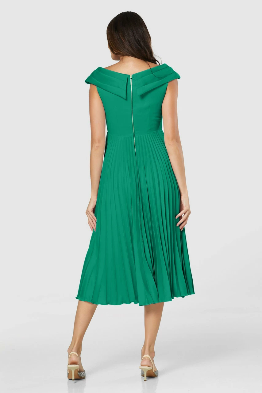 Style: Draped Neck Pleated Midi Dress