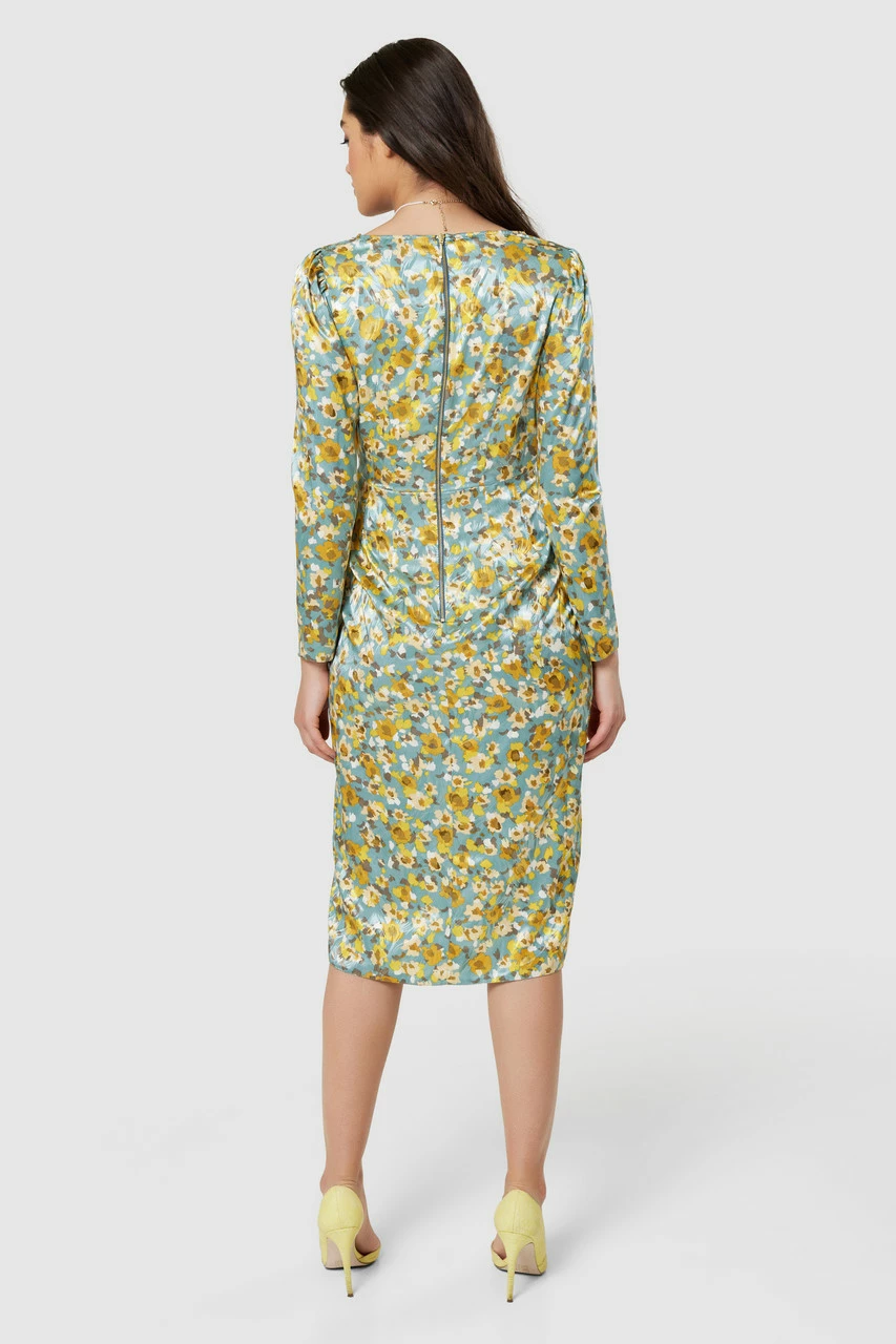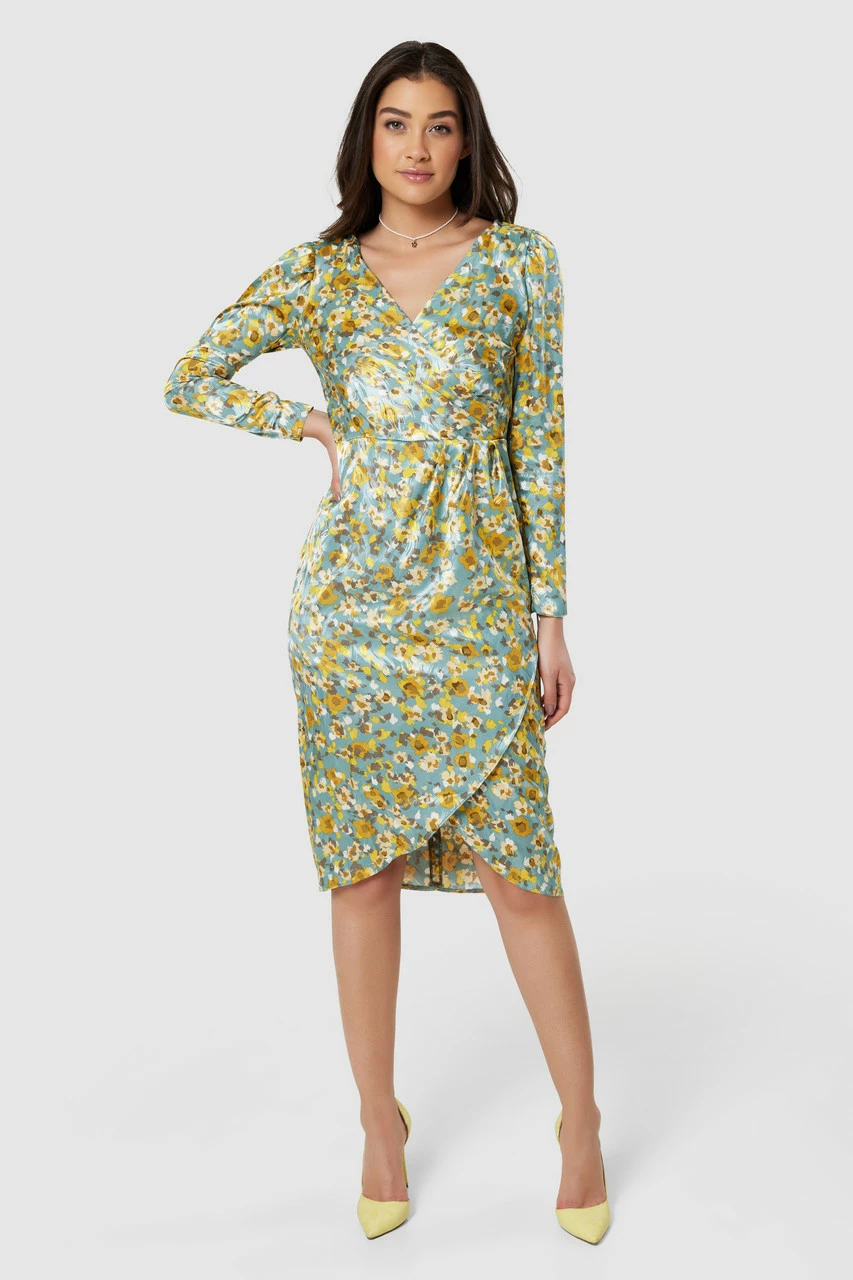 Details: Wrap front, Gathers on shoulders, Front drape detailing, Round back neckline