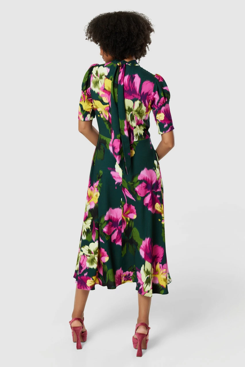 Introducing the Floral Print Midi Dress! This versatile, a-line silhouette dress features a beautiful floral print, half sleeves, and a high neckline. The midi length and tie-back detail make it perfect for both day and evening events.