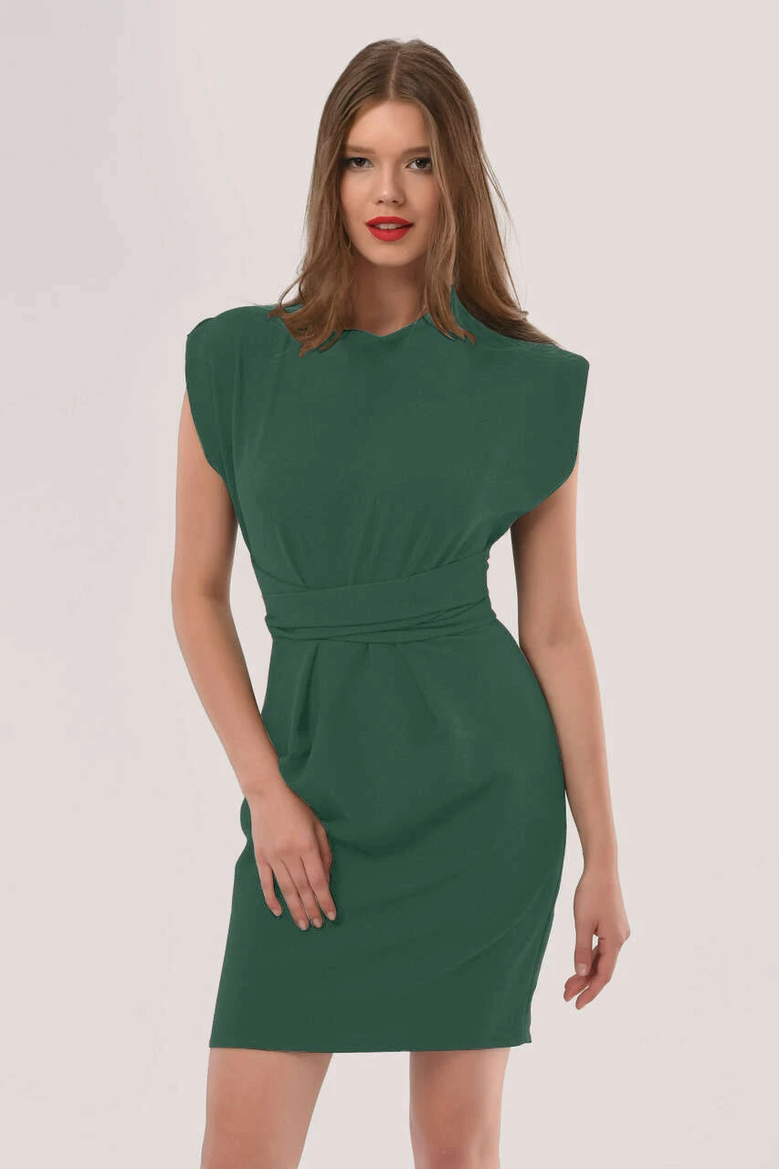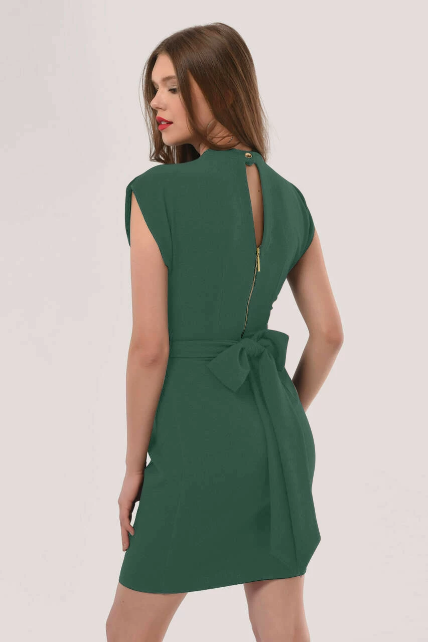 Details: Tie back waist, keyhole details, Cap sleeves, High collar, Mini dress, Wrap waist details