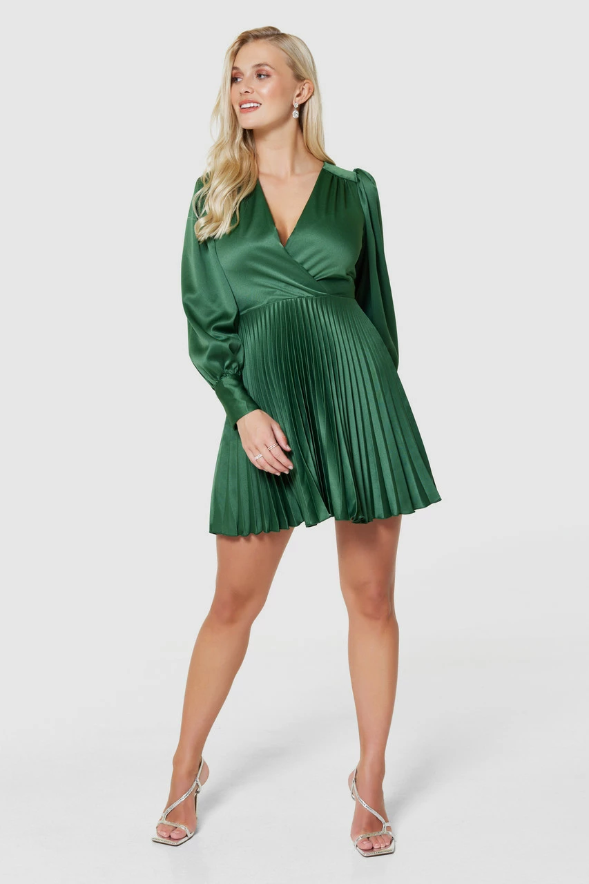 Details: Wrap front, Pleated skirt, Fit & flare hemline, Puff sleeves, Long cuff detailing, Mini