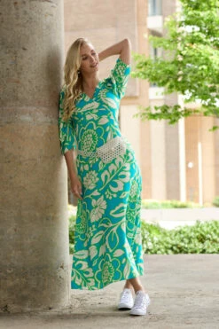 Another dress that works hard for it’s keep; buy it for a special occasion but wear it all summer long. The oversized turquoise and green floral print is eye-catching, but the shape is flattering.