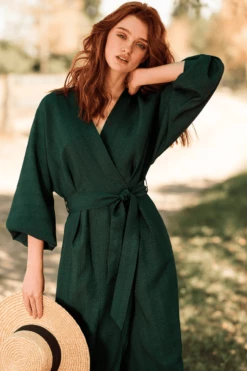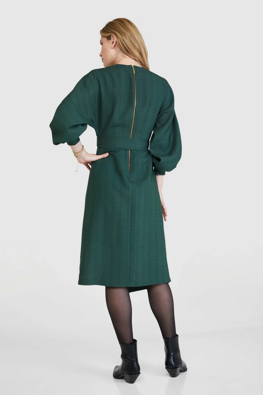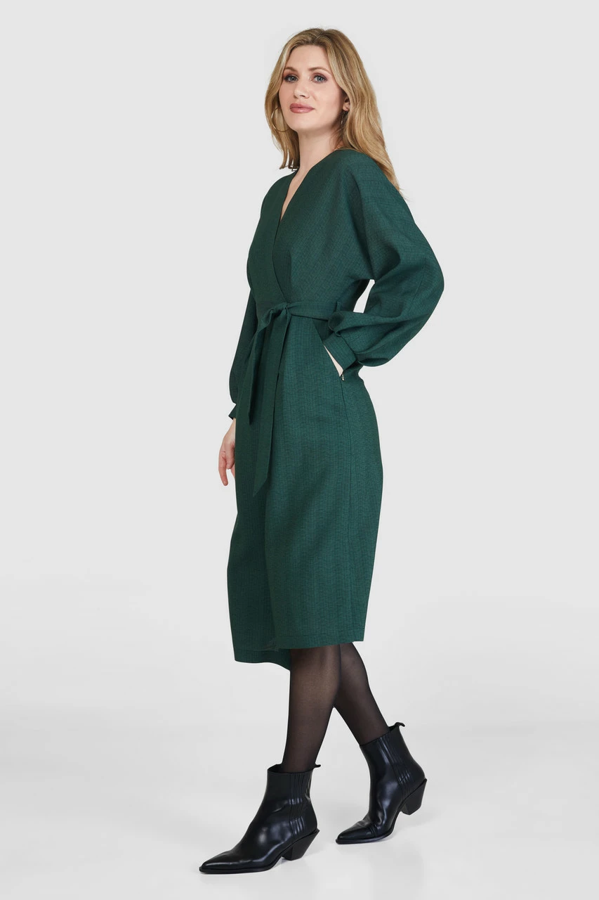 A new version of our bestselling Kimono wrap Dress with a generous puff sleeve, cuffs and an A-line skirt in a subtle stripe.