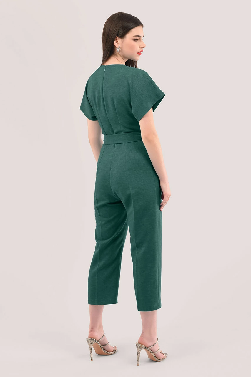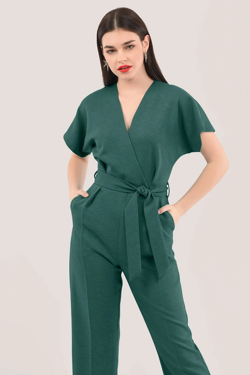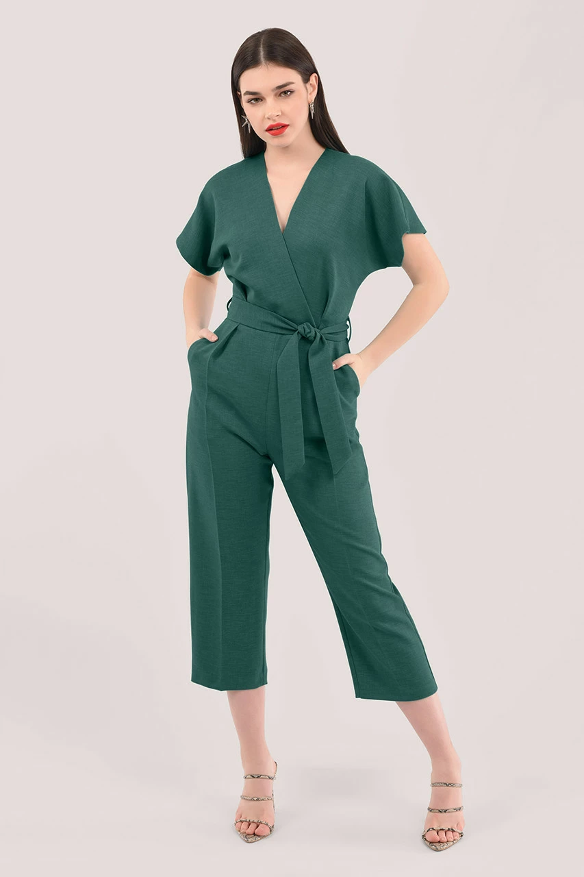 Details: Wrap front, Tie waist front, Side pockets, Unlined, Cropped leg, Kimono sleeves, Wide leg trousers, Belt included