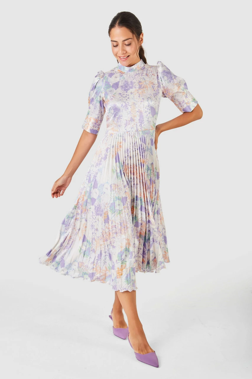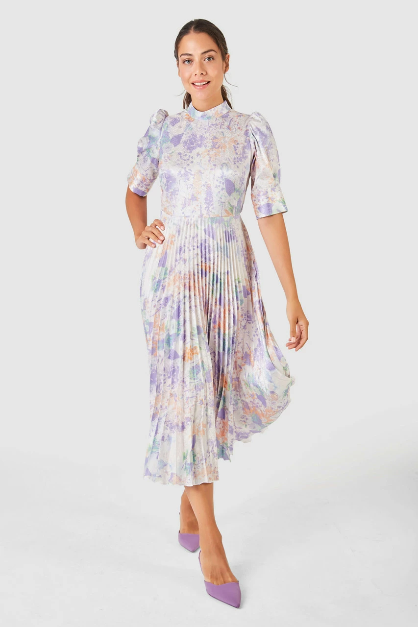 A floral printed subtle jacquard pleated Dress, updated with a high neck, puff sleeve and cuff.