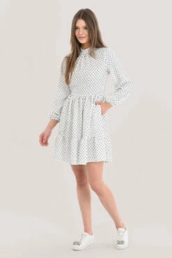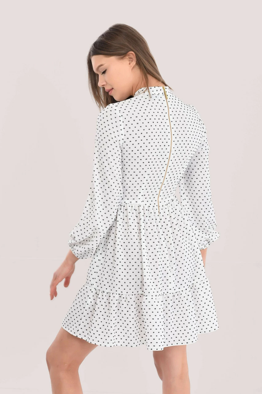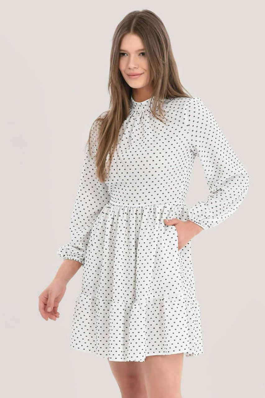 Details: Tiered dress, Puff sleeves, Gathers at shoulders & neck, Mini dress, Dobby dot design, Elasticated cuffs, A-line silhouette