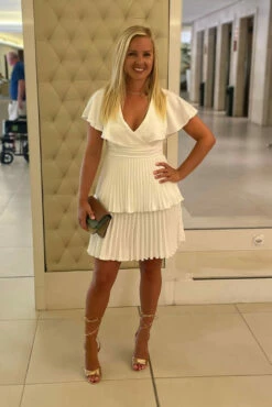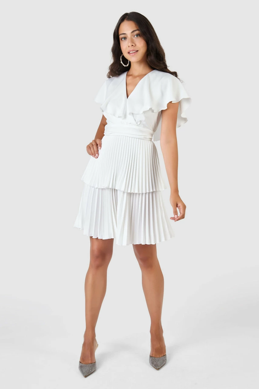 Details: Frill detailing, Cape sleeves, Fitted waistband, Mini dress, A-line silhouette, Pleated skirt, Tie up back waist