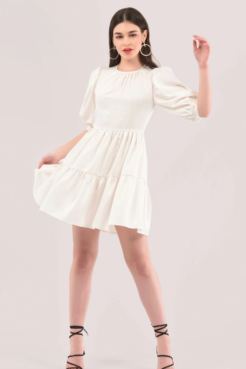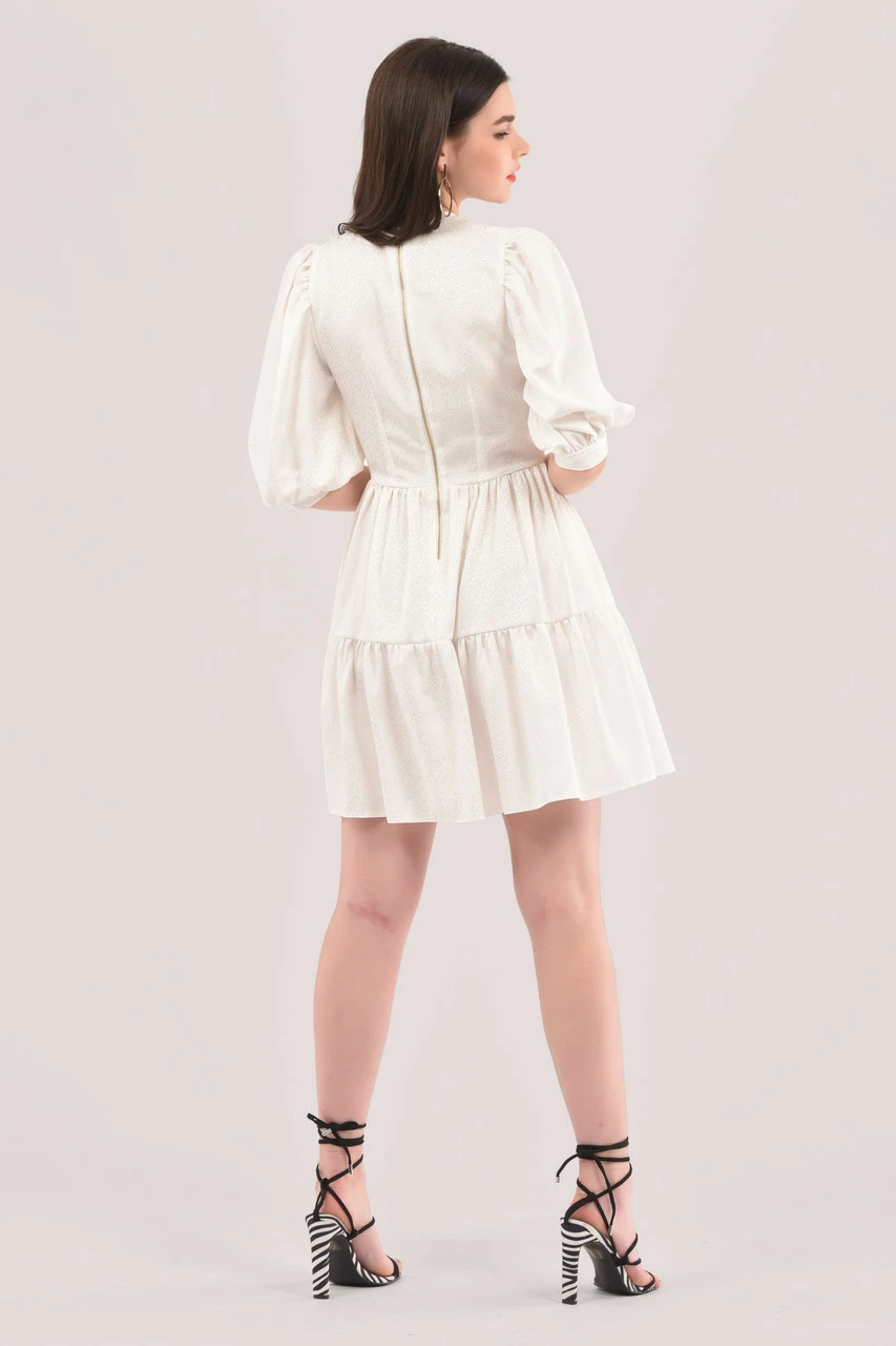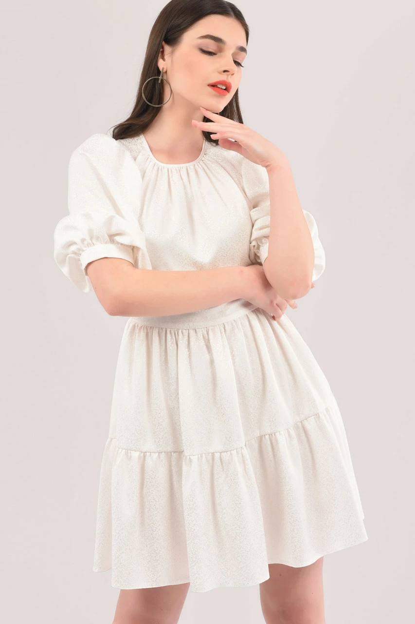 Details: Tiered dress, Puff sleeves, Gathers at shoulders & neck, Cuff details, Side pockets, Mini dress