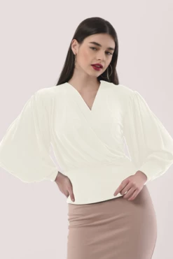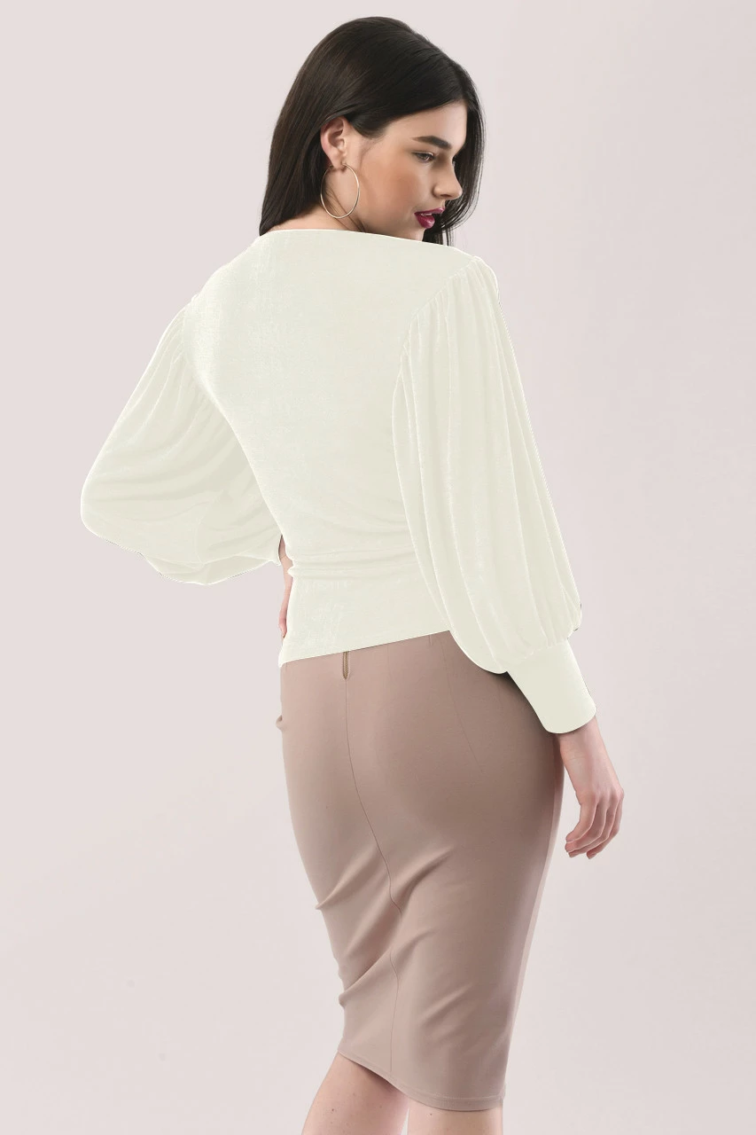 Details: Wrap front, Puff sleeves, Gathers on shoulders, Body fitted, Front pleat details, Drape wrap bodice