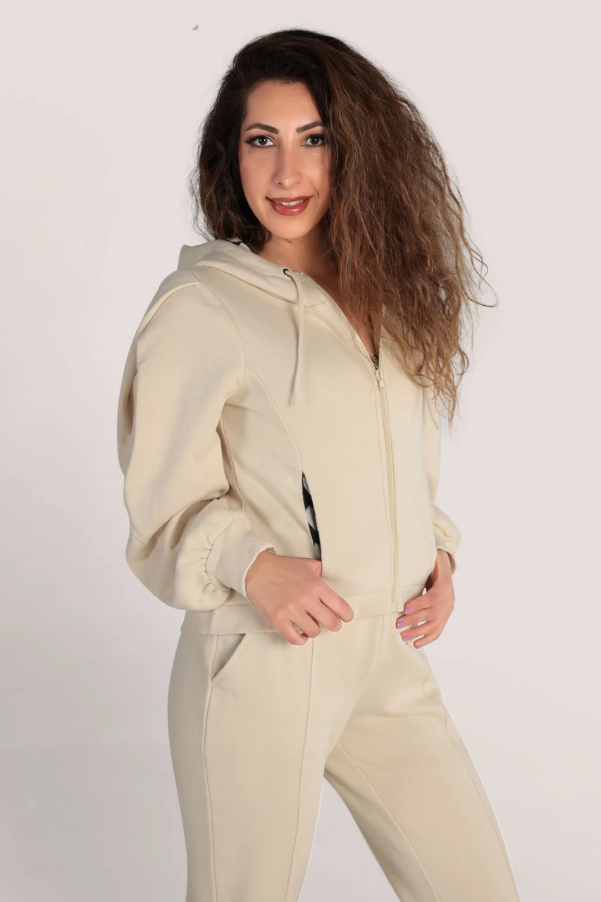 Details: Side pockets, Slim-line silhouette, Print lining, Mock neckline, Dropped hem, Slouchy hood, Voluminous puff sleeve,