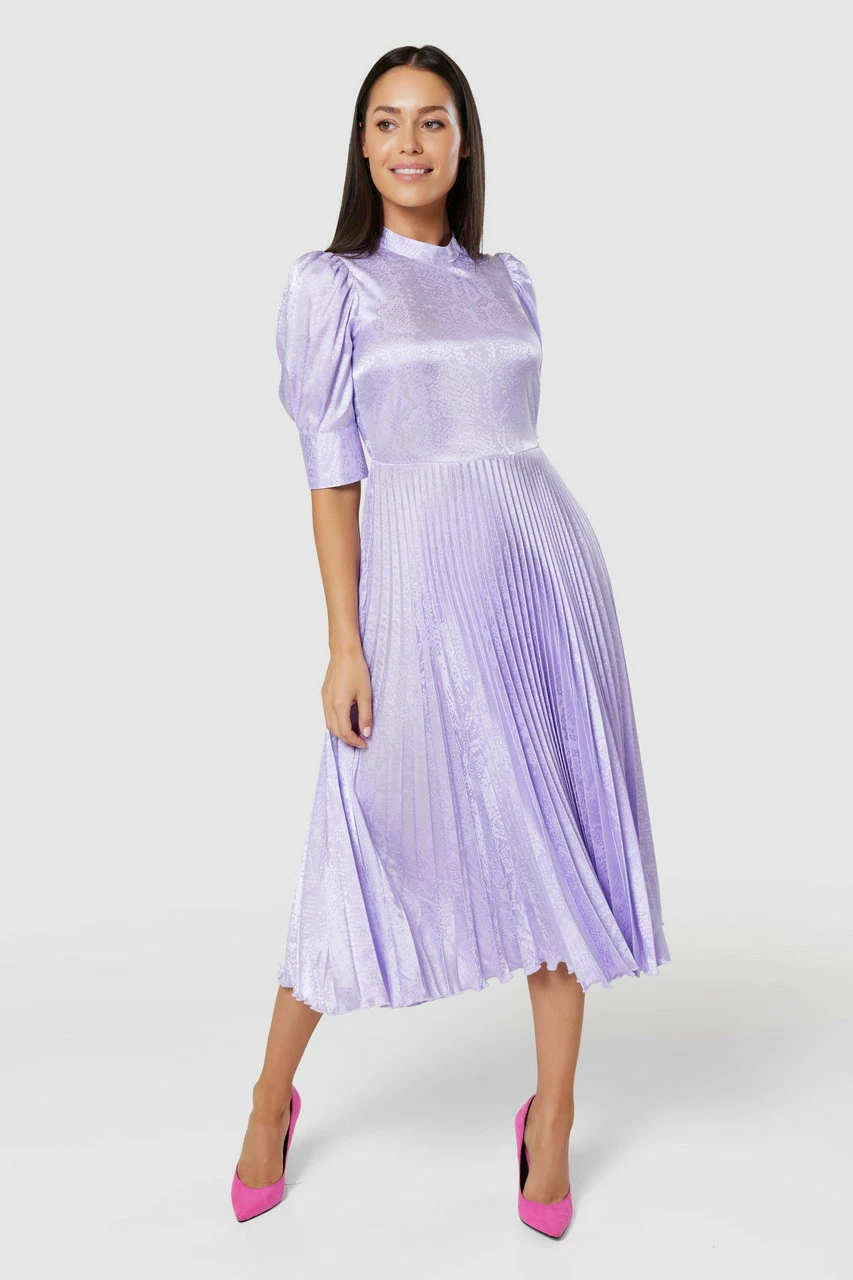 A soft lilac snake jacquard pleated dress with slim mandarin collar and puff sleeves with a cuff