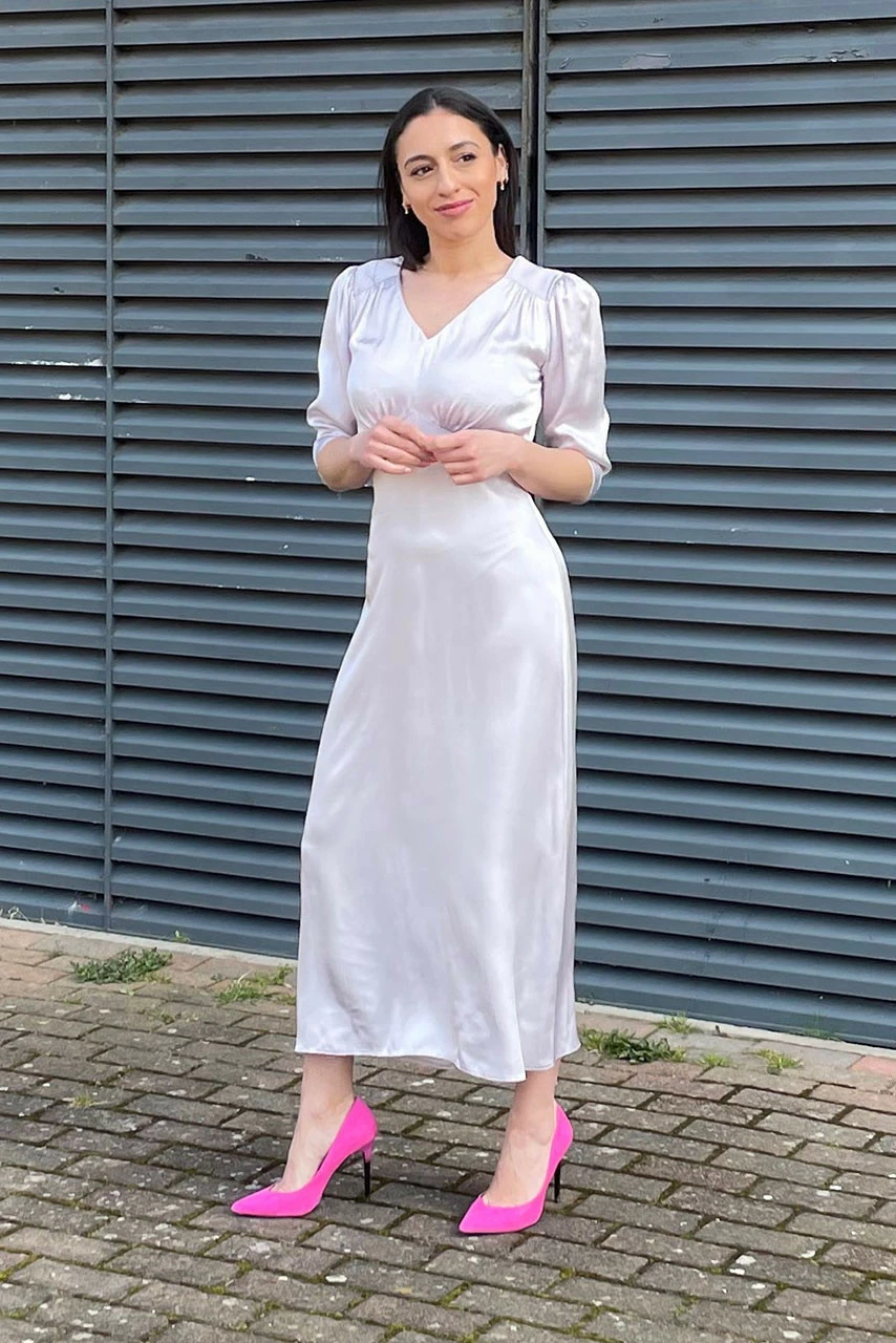 An elegant V-Neck, A-line Dress in a beautiful Viscose Satin.