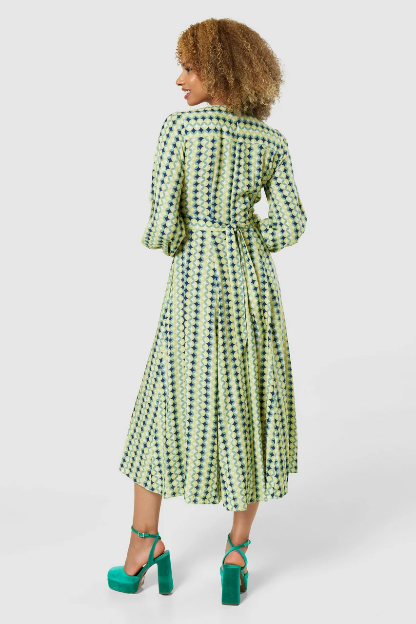 A midi dress in a nice Viscose print has become a staple in all of our closets. This dress is a perfect example of its universal appeal; it has a full paneled skirt, long sleeves, a wrap front, and pockets.